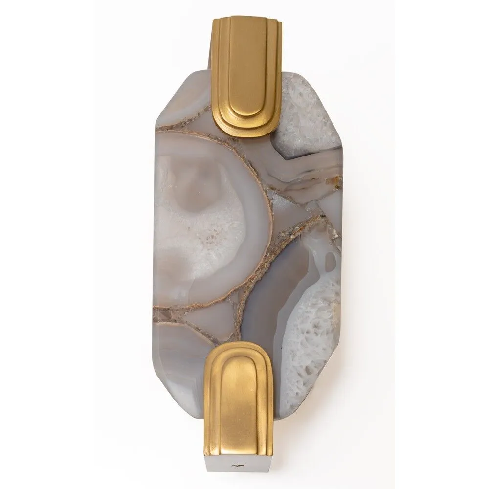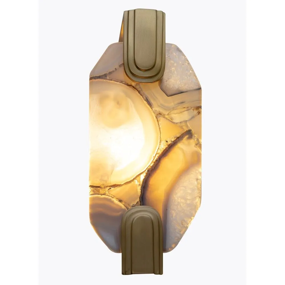 يضئ المصباح الجداري الحجري المعتم نورا وهاجا حول المساحة المجاورة له، ويتميز بدرجة مثالية من النحاس الذهبي وحجر العقيق الزجاجي المشطوف. يرجى الملاحظة: كل قطعة من حجر العقيق فريدة من نوعها، وتحتوي على طابعها الخاص بأنماط عروق طبيعية. لذلك، لا يمكننا ضمان تطابق كل قطعة مع الأخرى.