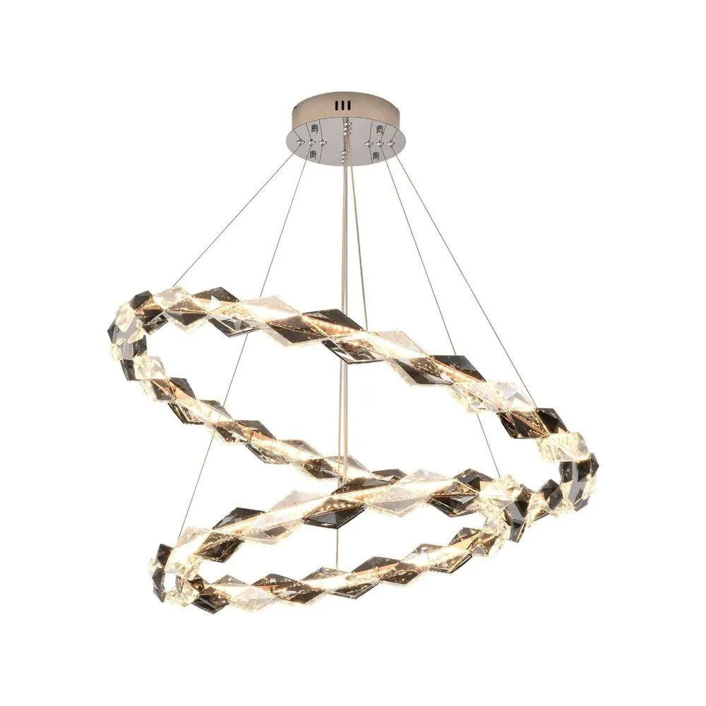 اضاءة معلقة مودرن أنيقة بتصميم فاخر مكون من حلقتين متداخلتين مزينتين بالكريستال البراق لتعكس إضاءة دافئة وجذابة بدرجة حرارة 3000 كلفن. بأقطار 80 سم و60 سم وارتفاع تعليق يصل إلى 150 سم، تعتبر خيارًا مثاليًا لمن يبحث عن قطعة إضاءة تجمع بين الفخامة والعصرية، لتزيين غرف المعيشة، الصالات، أو غرف الطعام بإطلالة ساحرة تخطف الأنظار.