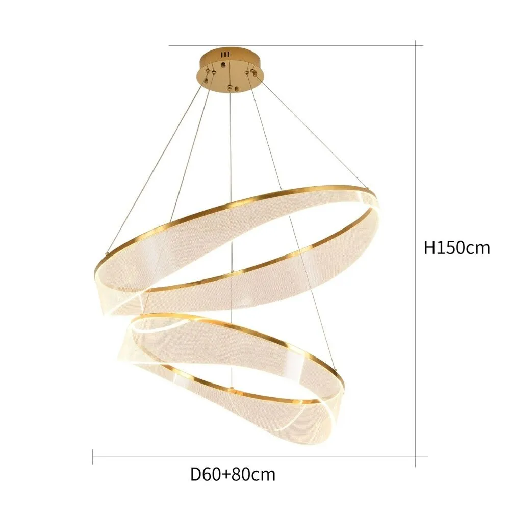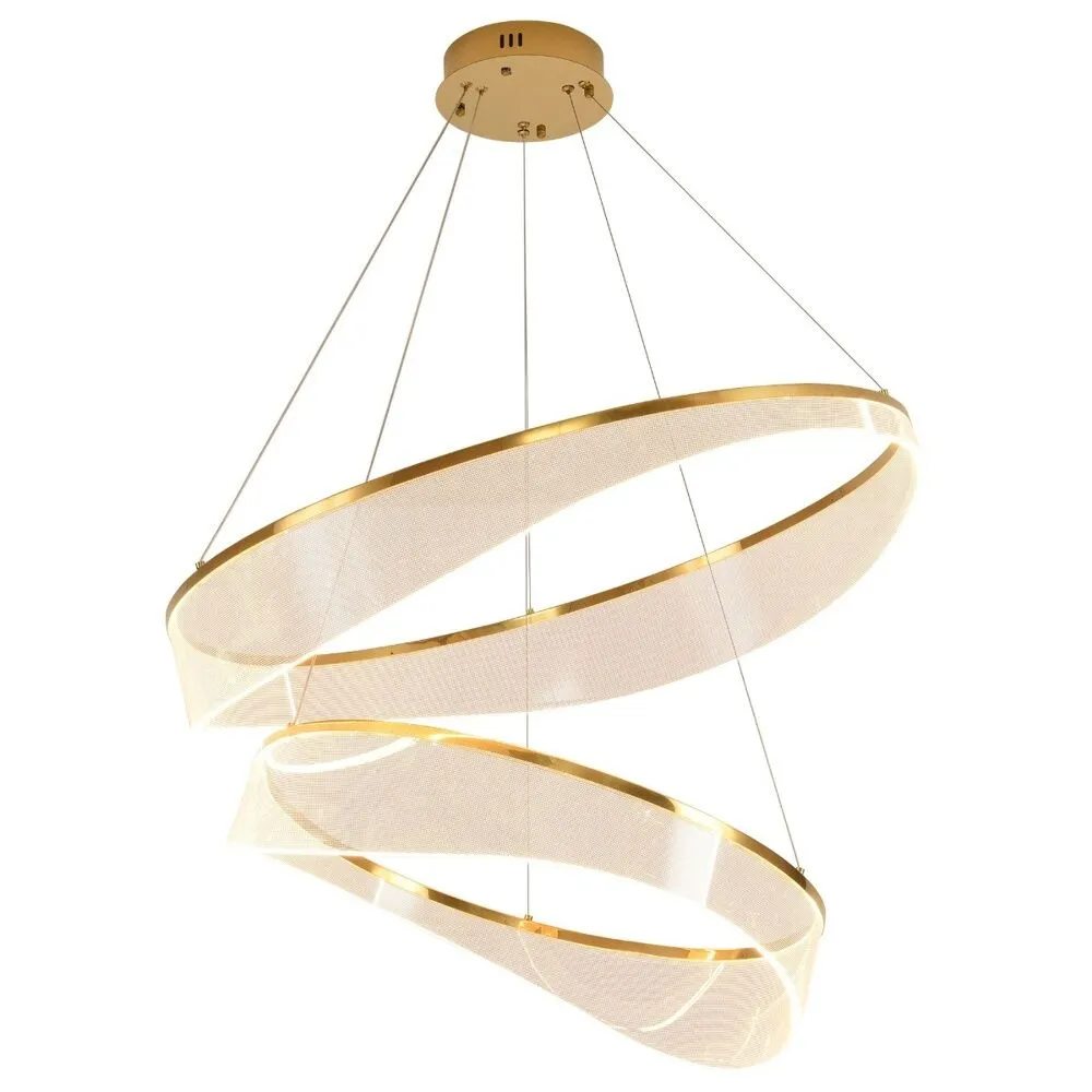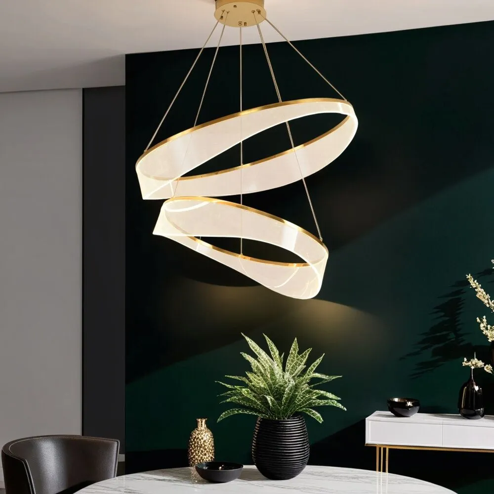 انارة معلقة سقف مودرن بتصميم حلقتين متداخلتين من نوركو، تتميز بشكلها الإبداعي الذي يضفي طابعاً فنياً ومعاصراً لأي مساحة داخلية. تأتي باللون الذهبي الأنيق وهي مصنوعة من الحديد والألمنيوم مع لمسات أكريليك شفافة لتوزيع الضوء بشكل ناعم ومتوازن. بقدرة 38 واط وإضاءة دافئة بدرجة 3000 كلفن، توفر هذه الانارة معلقة إنارة مريحة ومثالية لغرف المعيشة، غرف النوم أو صالات الاستقبال. تصميمها يسمح بضبط ارتفاع الحلقات حتى 150 سم لتتناسب مع ارتفاعات الأسقف المختلفة، كما أن تركيبها سهل وسريع وفقًا لدليل التعليمات المرفق.