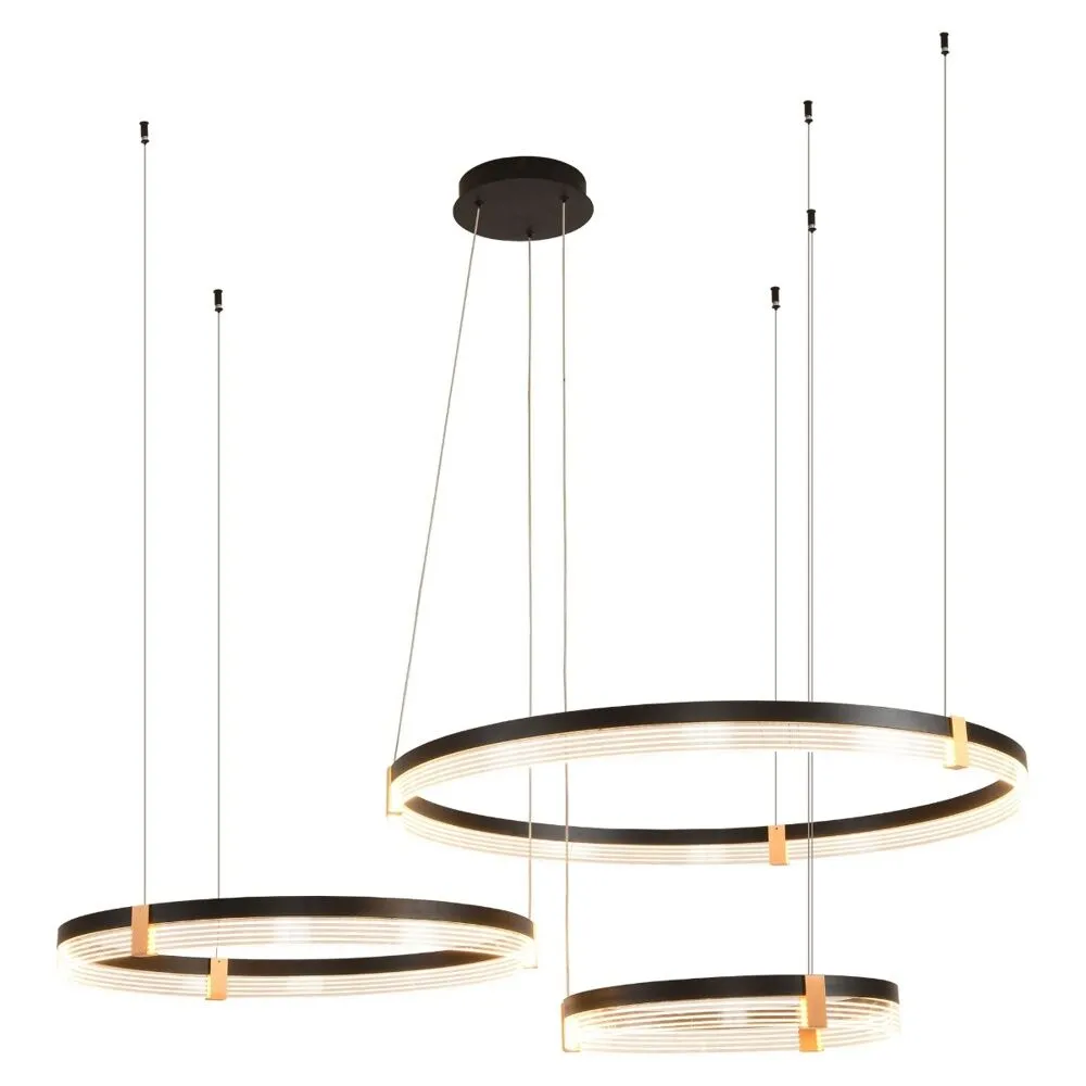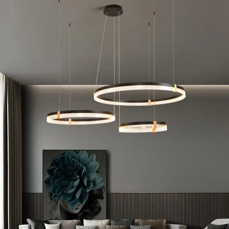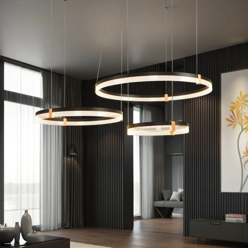 انارة معلقة مودرن أنيقة تتكون من ثلاث حلقات متدرجة بأقطار 40 سم، 60 سم، و80 سم، بتصميم عصري مثالي لغرف المعيشة، غرف الطعام، والمجالس. تأتي بإضاءة LED مدمجة بقوة 60 واط ودرجة لون 3000 كلفن، مما يوفر إضاءة دافئة ومريحة. مصنوعة من الألمنيوم عالي الجودة لمنع الصدأ، مع حامل سقفي من الحديد يضمن المتانة والاستقرار، إضافة إلى غطاء أكريليك شفاف يوزع الضوء بشكل متساوٍ دون توهج. تعمل بجهد 220-240V وتتميز بتصنيف IP20 للاستخدام الداخلي.
