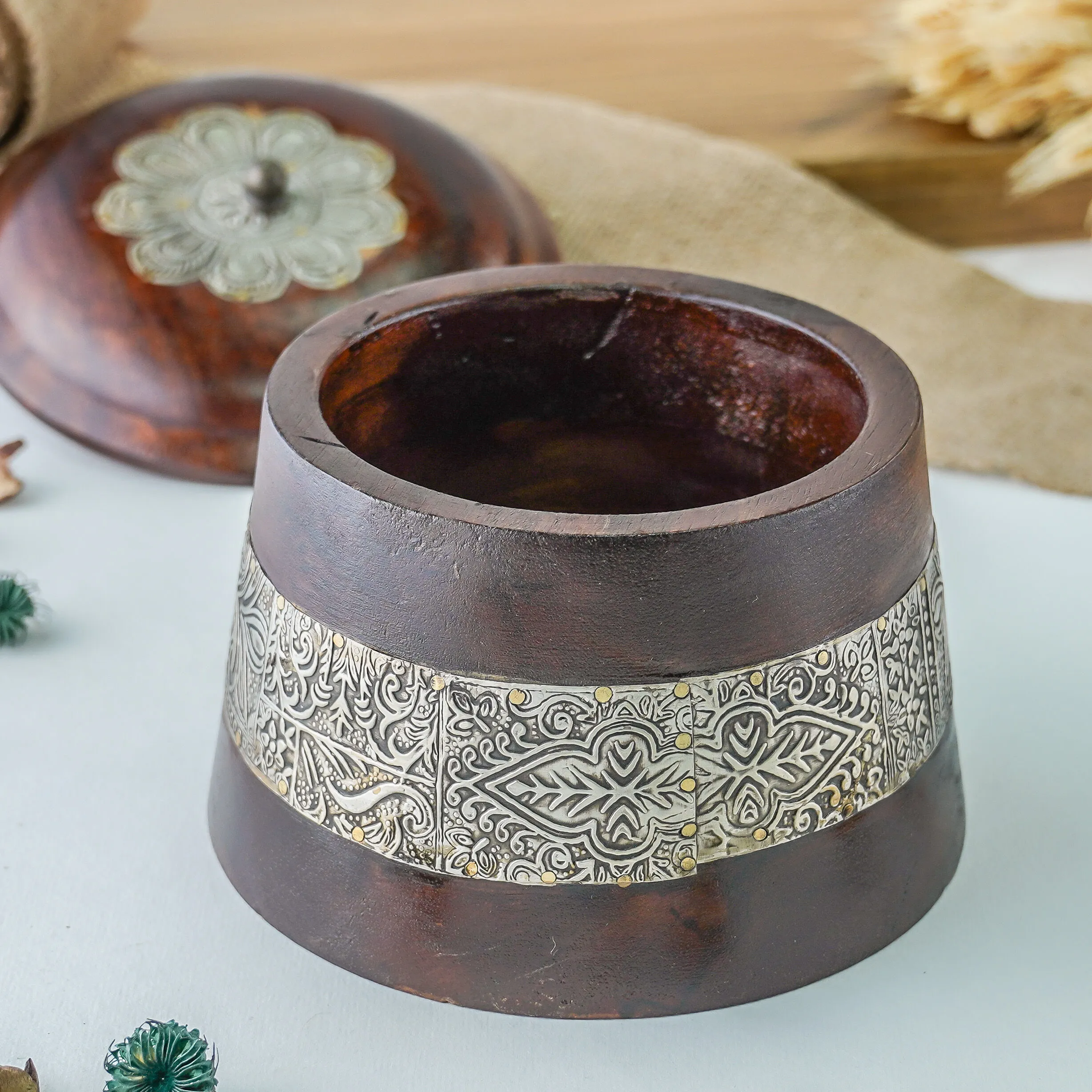 التمرية مصنوعة يدوياً من الخشب العالي الجودة والمصقول ومطعمة بالنحاس المزخرف بزخارف شرقية مميزة.