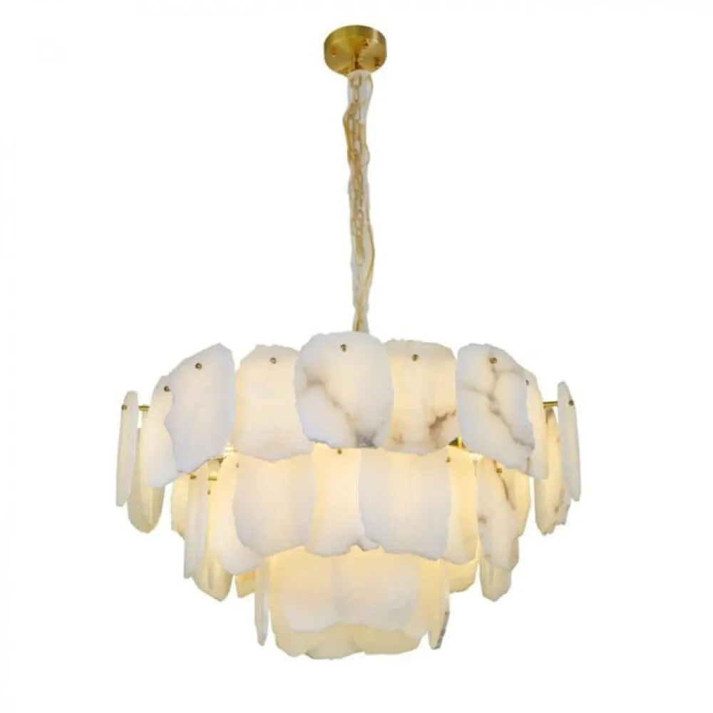 ثريا علاقي رخام إسباني طولي أبيض مع فريم برونزي تعمل على إضفاء جو من الدفء والراحة في المساحة التي توضع فيها تعمل هذه المصابيح على توزيع الضوء بشكل متساوٍ في جميع الاتجاهات، مما يخلق أجواء مريحة ومنعشة تحتاج الى 16 لمبات.