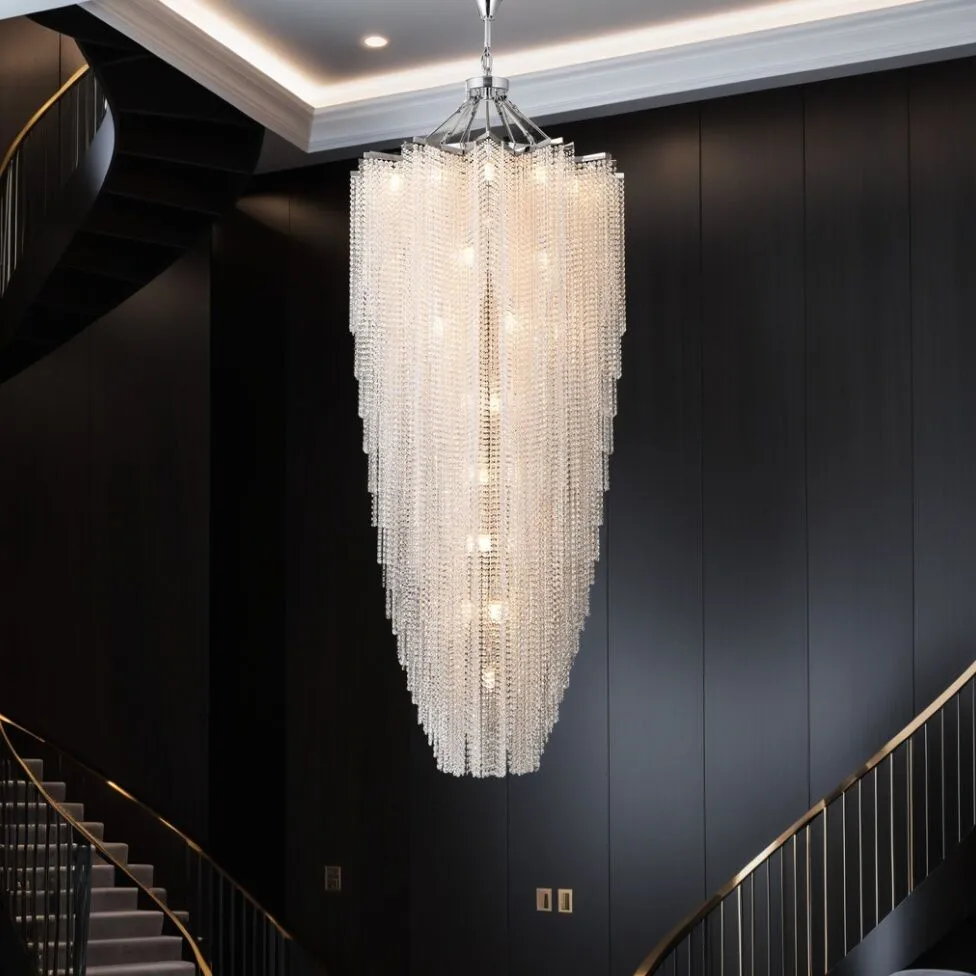 ثريا نيوكلاسيك تضيف لمسة من الفخامة والرقي إلى المساحات الداخلية الكبيرة بفضل تصميمها الأنيق المكون من سلاسل متدلية بشكل مرتب وجذاب. بقطر يبلغ 100 سم وارتفاع رئيسي 200 سم، مع ارتفاع كلي يصل إلى 300 سم، تعد هذه الثريا مثالية للقاعات والسلالم ذات الأسقف العالية. تدعم 37 لمبة بقاعدة E14 لتوفير إضاءة مشرقة ومتوازنة تلائم الأجواء الفاخرة. تم تصنيعها من مواد عالية الجودة لضمان المتانة وطول العمر، مما يجعلها خيارًا مثاليًا للمساحات التي تحتاج إلى عنصر تصميم مميز وإضاءة متألقة.