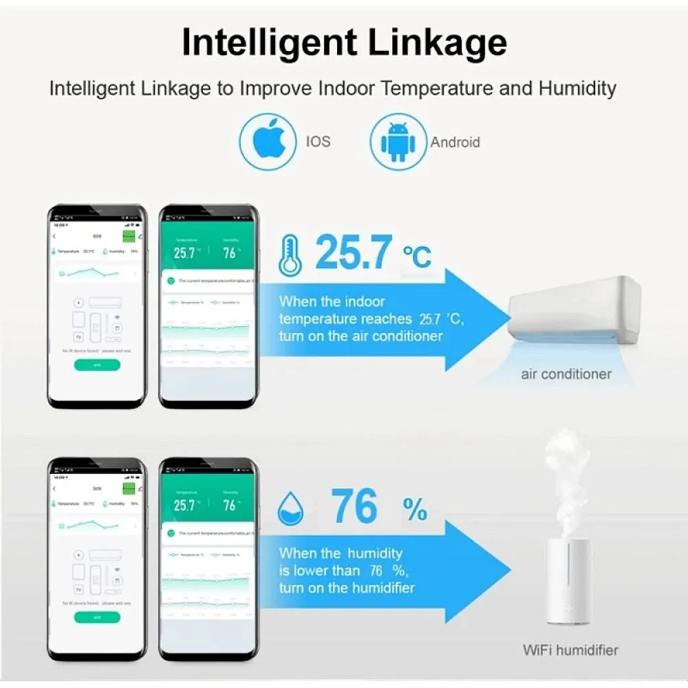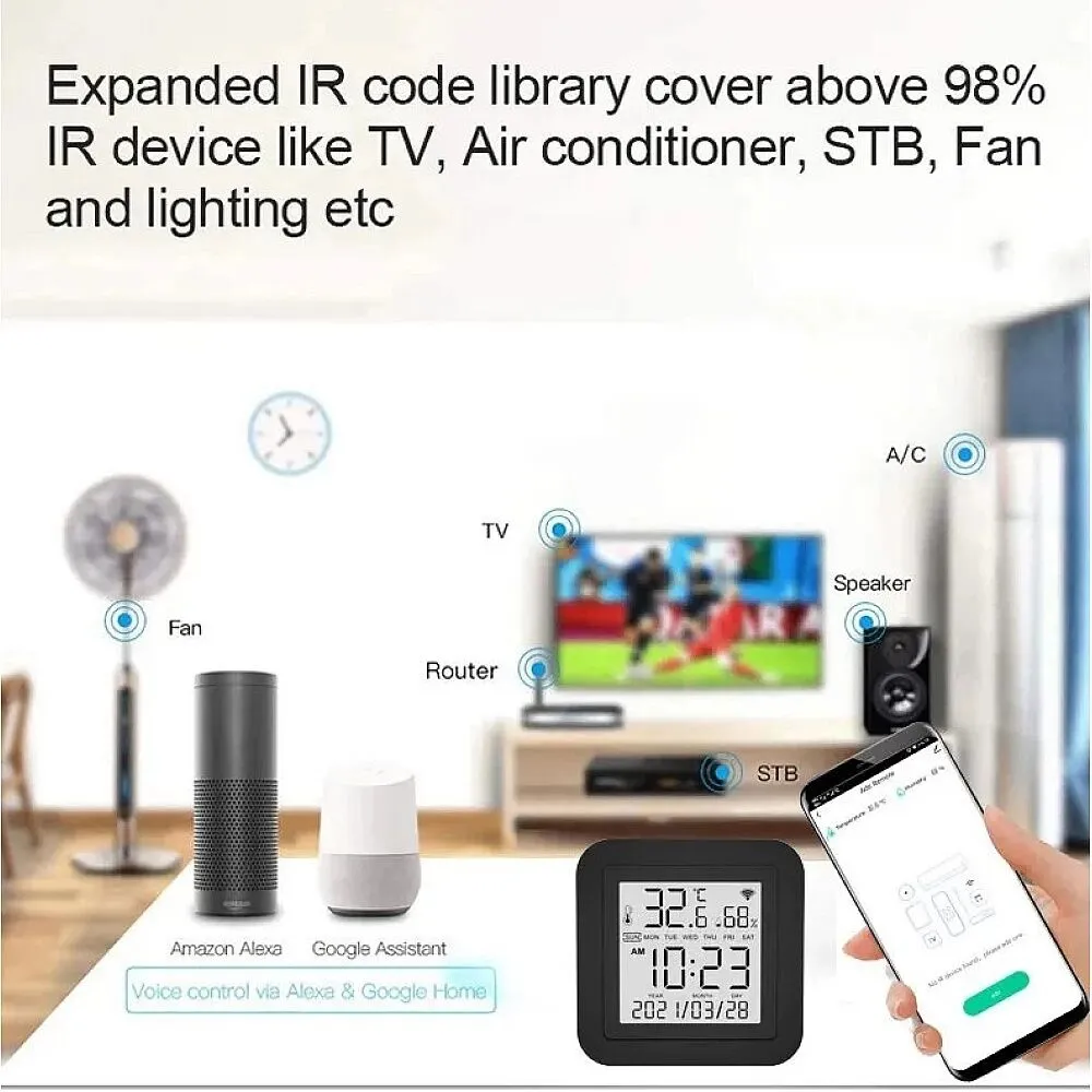 هذا الجهاز الذكي يقدم مجموعة واسعة من الميزات لتوفير تجربة مريحة وذكية للمستخدم. إليك وصف مفصل للميزات:التحكم عن بعد بالأشعة تحت الحمراء: يتيح لك هذا الجهاز التحكم عن بعد في الأجهزة التي تعمل بالأشعة تحت الحمراء مثل مكيفات الهواء وأجهزة التلفاز والمرواح والأقراص الرقمية وغيرها، مع إمكانية تخزين آلاف الرموز للتحكم بمختلف الأجهزة.وظيفة النسخ DIY: يمكن للمستخدم نسخ وظائف أجهزته التحكم بالأشعة تحت الحمراء بنفسه إذا لم يجدها في التطبيق، مما يتيح له استخدام الأجهزة التقليدية بسهولة.مشاهد ذكية: يمكنك إنشاء مشاهد ذكية للتحكم في عدة أجهزة بضغطة زر واحدة، مثل تشغيل وضع المنزل الذكي الذي يقوم بتشغيل المكيفات والتلفاز وجهاز تنقية الهواء التي تعمل بتقنية WIFI .مراقبة درجة الحرارة والرطوبة: يتضمن الجهاز استشعارًا دقيقًا لمراقبة درجة الحرارة والرطوبة في البيئة، مع إمكانية عرض القراءات في التطبيق وضبط الأجهزة تلقائيًا وفقًا لها.شاشة LCD عالية الجودة: توفر شاشة عرض واضحة وسهلة القراءة لعرض الوقت ودرجة الحرارة والرطوبة، مما يتيح للمستخدم مراقبة الظروف البيئية بسهولة.التحكم عبر التطبيق والصوت: يمكن للمستخدم التحكم في الأجهزة عبر التطبيق المجاني، بالإضافة إلى إمكانية التحكم الصوتي باستخدام أجهزة مثل Amazon Alexa.توافق مع العديد من العلامات التجارية والأجهزة: يتوافق الجهاز مع مجموعة واسعة من العلامات التجارية وأجهزة التحكم بالأشعة تحت الحمراء وتردد الراديو.تشغيل بلوتوث سريع ومزامنة التطبيق: يوفر التطبيق سرعة في التوصيل عبر بلوتوث ومزامنة تلقائية مع توقيت الهاتف.باستخدام هذا الجهاز الذكي، يمكن للمستخدم الاستمتاع بالراحة والتحكم الذكي في الأجهزة المنزلية بسهولة وفعالية.