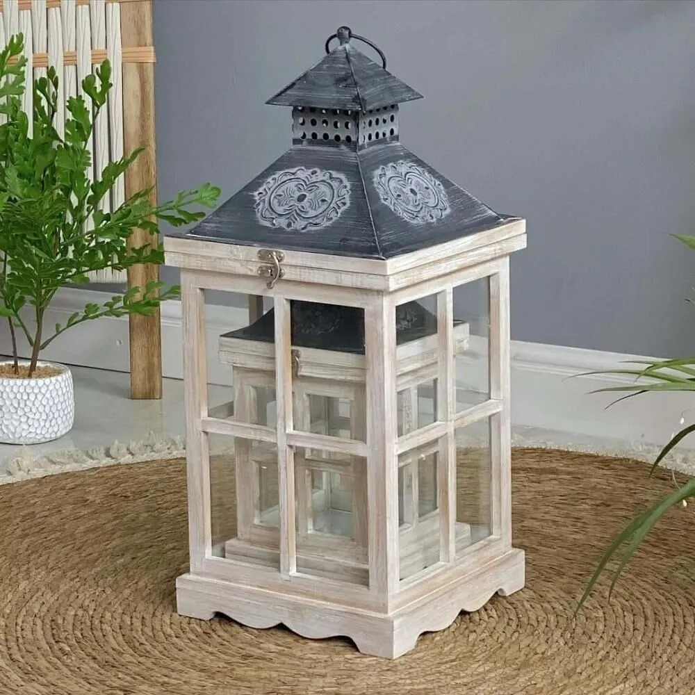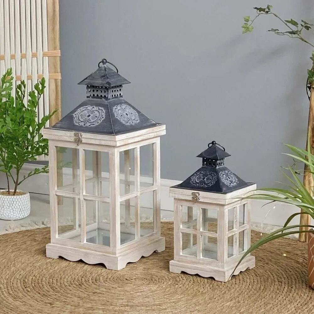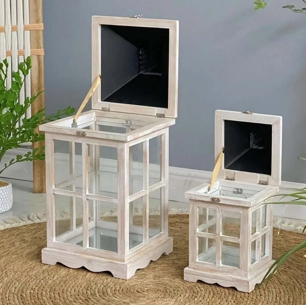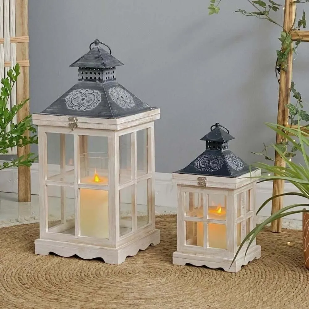 التي تم تصنيعها يدويًا من الخشب الطبيعي بأسلوب عصري بسيط للغاية. تتميز الفوانيس بلمسة ريفية ولون ابيض عتيق مما يضيف الأناقة إلى زينة رمضان المنزلية.