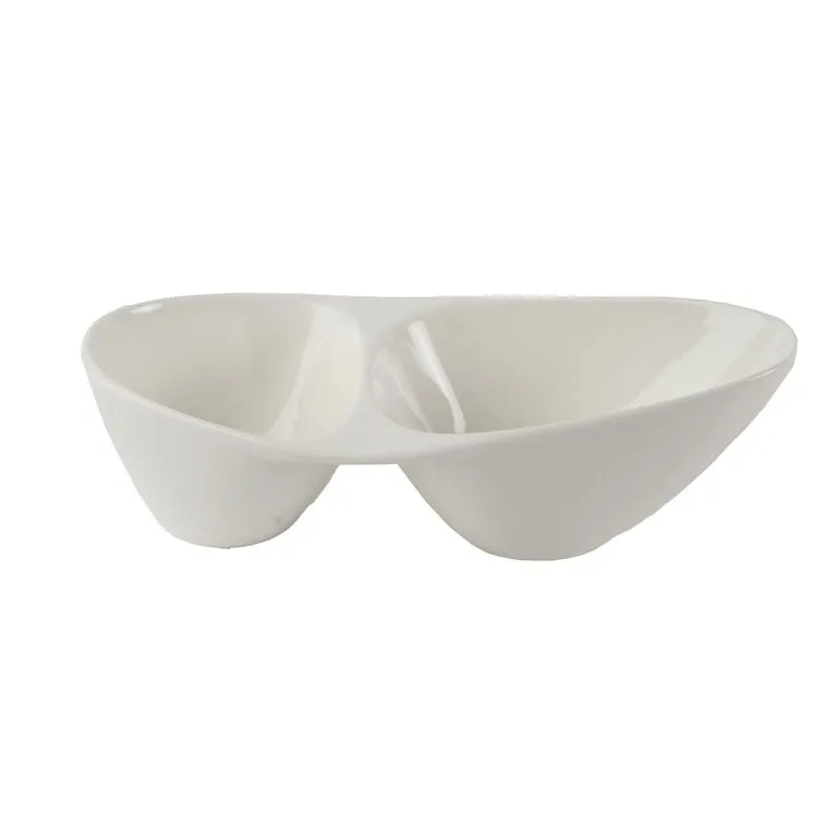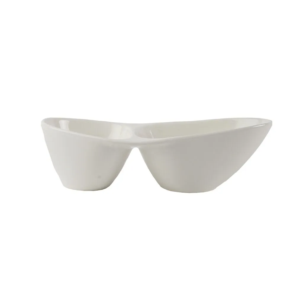 زبدية دائرية الشكل مقسم إلى قسمين مصنوعة من البورسلان باللون الأبيض ذو عمق مناسب لإحتواء مختلف الأصناف, تعتبر اختيار مثالي لتقديم وتنسيق الأطعمة بشكل جميل ومنظم.