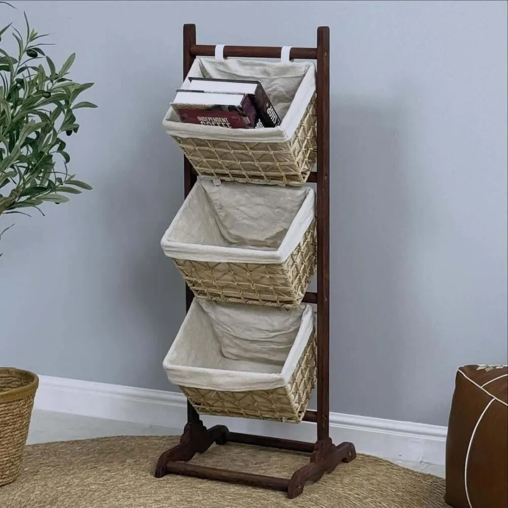 ستاند تخزين خشبي فاخر ب ـ3 سلال يدوية من الحبال مع بطانة قماش ناعمة – قطعة ديكور عملية بأناقة طبيعية!