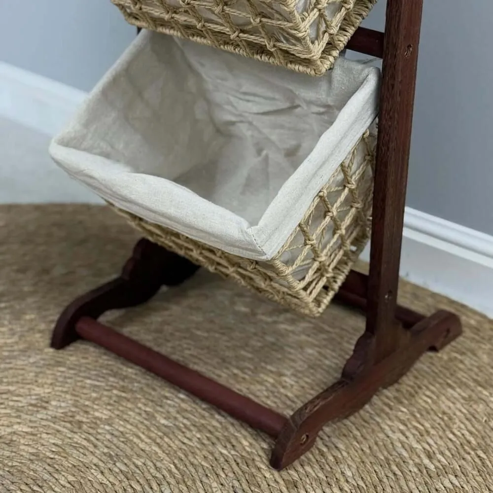 هذا الستاند الخشبي الأنيق يجمع بين الوظيفة والجمال بطريقة مدهشة! مصنوع بعناية من الخشب الطبيعي، ويحتوي على 3 سلال واسعة مصنوعة يدويًا من الحبال القوية، مبطنة بالقماش الناعم للحفاظ على أغراضك بأمان وأناقة.