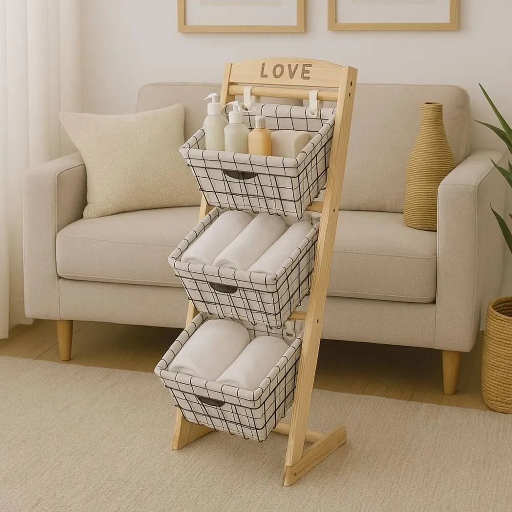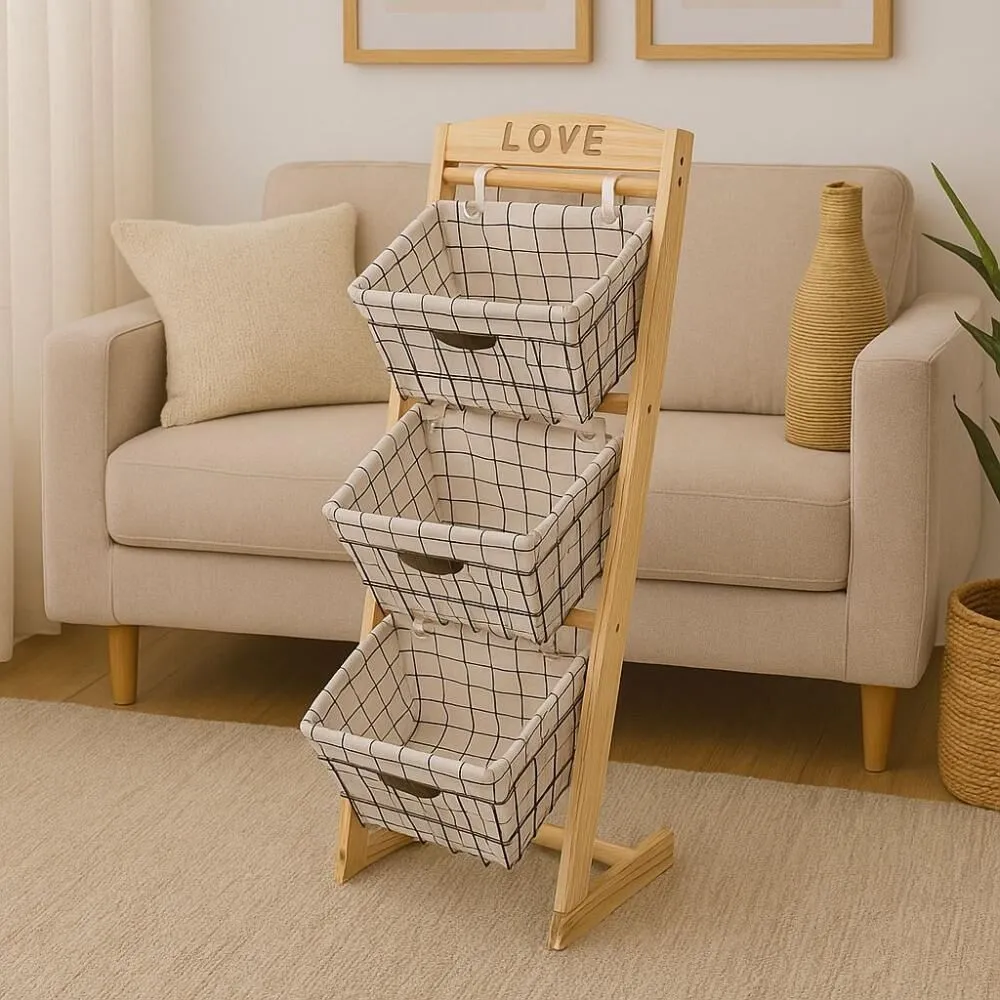 المميزات:مصنوع من خشب طبيعي تصميم عمودي موفّر للمساحة – مثالي للأماكن الصغيرة. 3 سلال يدوية الصنع من الحبال الطبيعية المتينة. بطانة قماش ناعمة وقابلة للإزالة والتنظيف. تصميم أنيق يتماشى مع جميع أنماط الديكور.