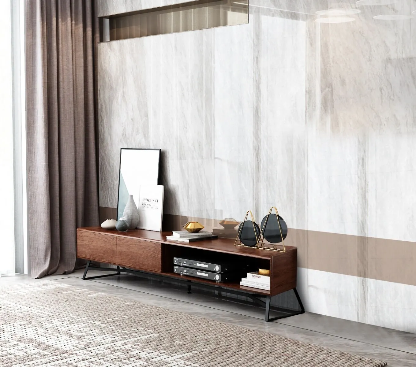 طاولة تلفزيون رونار خشبية و أرجل ستيل و سطح رخام أبيض - 200x53x40 سم