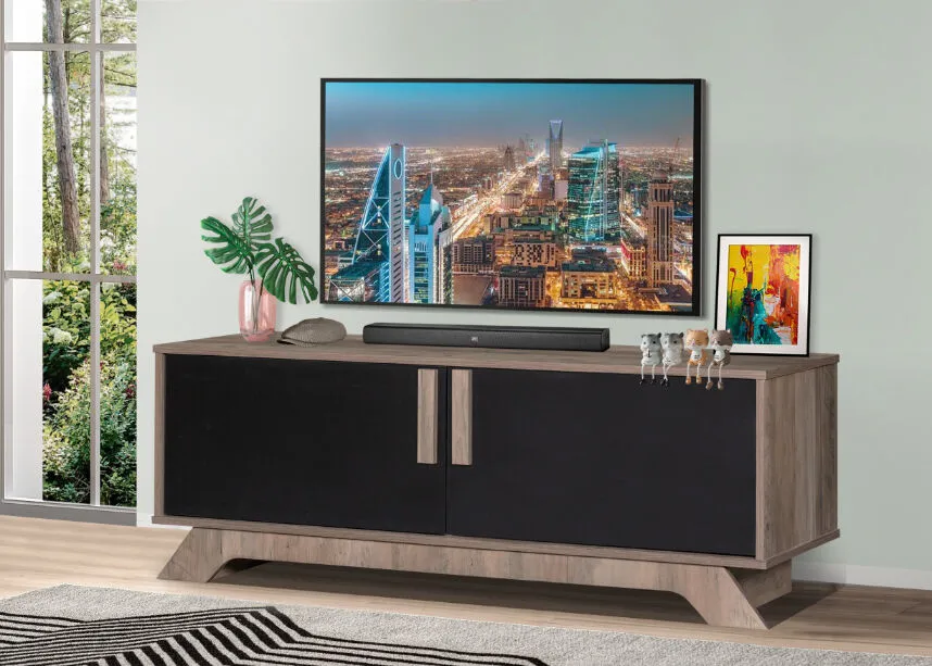 طاولة تلفزيون عصرية بتصميم مودرن مع لمسات كلاسيكية وذات ألوان هادئة متوافقة مع ألوان الديكور المختلفة. تحتوي الطاولة رفوف مغلقة بواسطة أبواب تمكنك من توفير المساحة وتنظيم ملحقات التلفزيون وبعض المقتنيات بمعزل عن الانظار. تتضمن الطاولة مخارج مخفية للأسلاك مما يجعل غرفة المعيشة مرتبة. ارتفاع القوائم مناسب لتنظيف الأرضيات تحتها كما أنها تتحمل الأوزان وتدعم هيكل الطاولة بشكل مثالي.