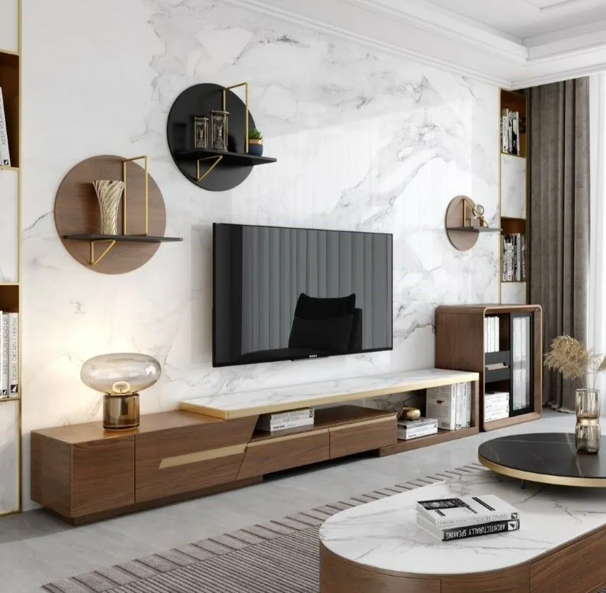 طاولة تلفزيون رونار خشبية و أرجل ستيل و سطح رخام أبيض - 200x53x40 سم