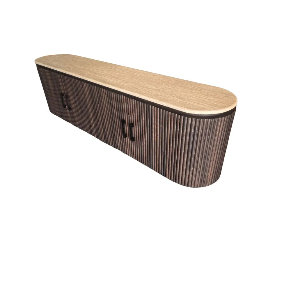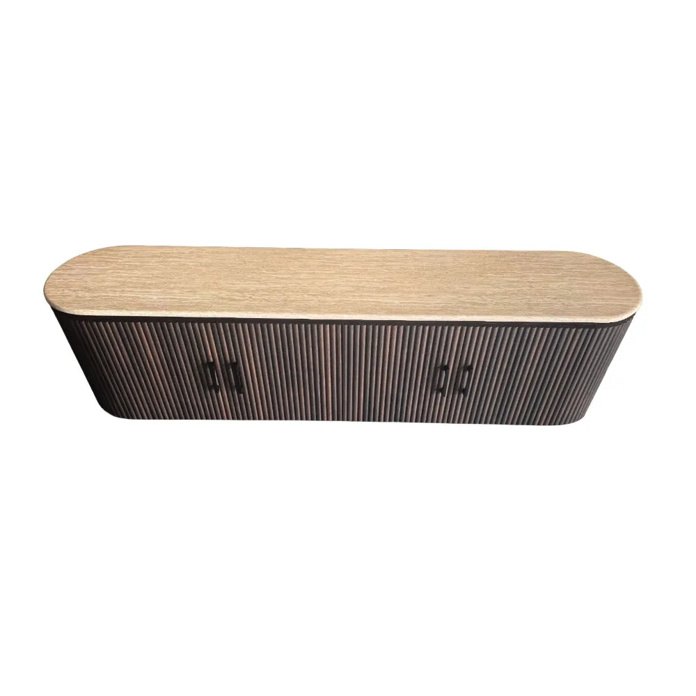 اجعل زاوية الترفيه أكثر أناقة مع هذه الوحدة الخشبية المودرن للتلفاز. تصميم انسيابي بواجهة مموّجة تضيف لمسة فنية مميزة، مع سطح علوي بلون بيج من الرخام الطبيعي دافئ مثالي لتزيين القطعة بإكسسوارات أو نباتات. تحتوي على أبواب تخزين واسعة مع مقابض تضيف تباينًا عصريًا جذابًا.
