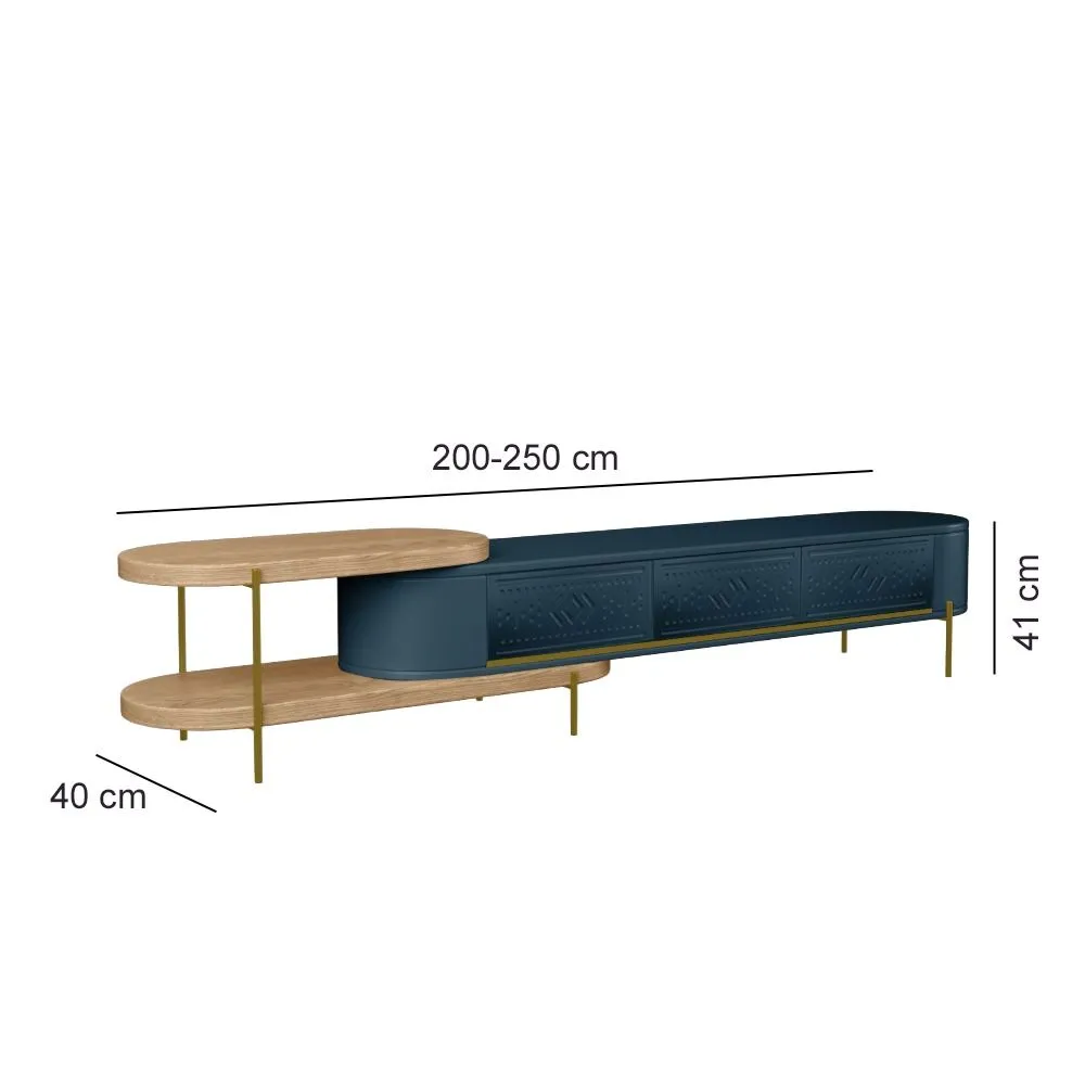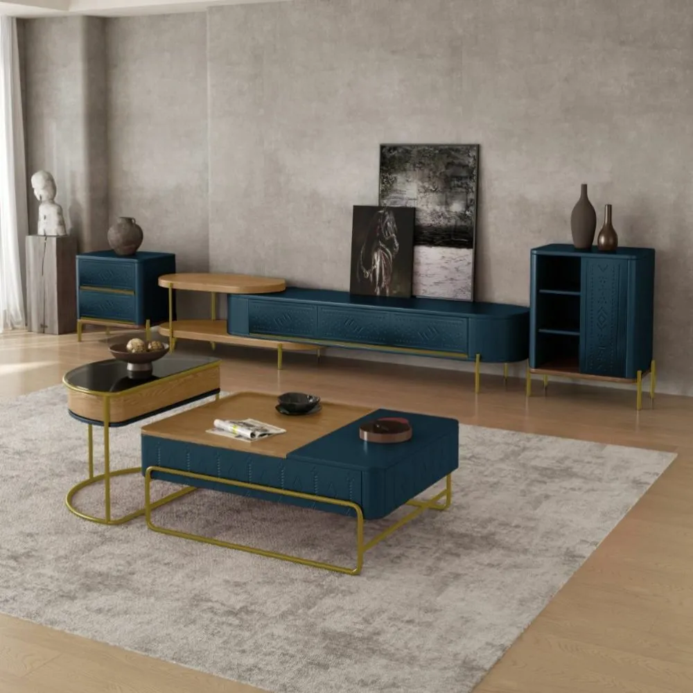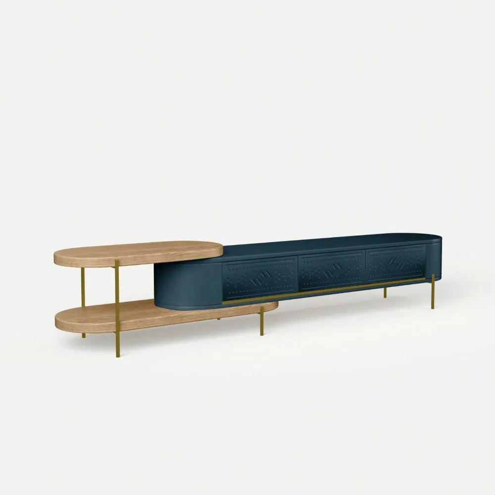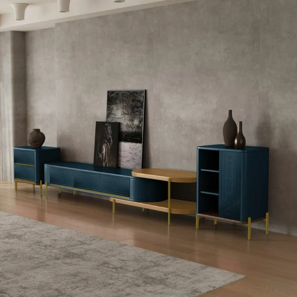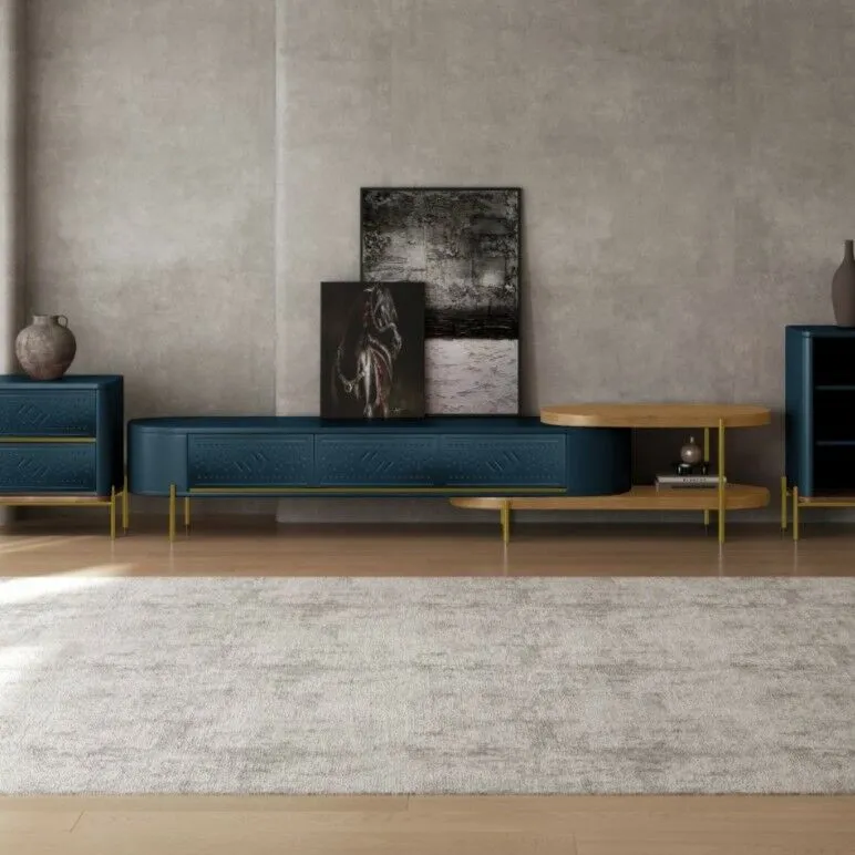 طاولة تلفزيون هي قطعة أثاث أنيقة تجمع بين الفخامة والعملية، بتصميم يجمع بين الطراز العصري والكلاسيكي. صنعت من مزيج متقن من الخشب MDF والفولاذ المقاوم للصدأ المطلي باللون الذهبي، مما يضفي لمسة من الدفء والرقي. يتألق الجزء الأيسر بوحدتين رف مفتوحتين، مثالية لعرض الإكسسوارات أو الكتب، بينما يتضمن الجزء الأيمن وحدة تخزين مغلقة بثلاثة أبواب مزخرفة بنقوش هندسية بارزة، باللون التركواز الذي يضفي عمقًا وجاذبية بصرية. تستند القطعة على أرجل رفيعة باللون ذهبي، ما يمنحها خفة وأناقة دون المساس بالثبات. هذه القطعة ليست مجرد وحدة تلفاز، بل هي إضافة فنية تعزز من جمال أي مساحة داخلية.