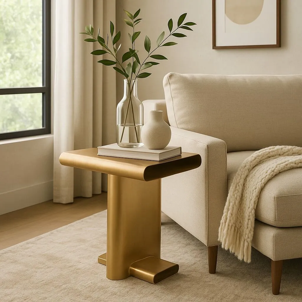 طاولة جانبية ذهبية بتصميم فاخر – طاولة حديد أنيقة للمجالس والديكور العصريارتقِ بديكور منزلك مع لمسة فخامة خالدة بفضل هذه الطاولة الجانبية المصنوعة من الحديد الفاخر والمطلية باللون الذهبي المطفأ. تأتي بتصميم هندسي عصري مستوحى من الأسلوب المعماري الحديث، ما يجعلها مثالية كقطعة ديكور مميزة بجانب الكنب أو في الزوايا.هذه الطاولة المعدنية الراقية ليست فقط أنيقة، بل عملية أيضًا، بسطح مستطيل مثالي لوضع الكتب، الإكسسوارات، أو فنجان القهوة في جلسات الضيافة.المميزات: