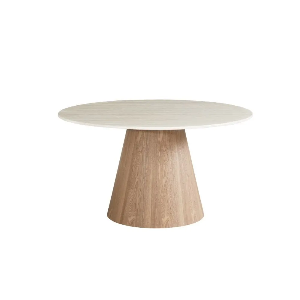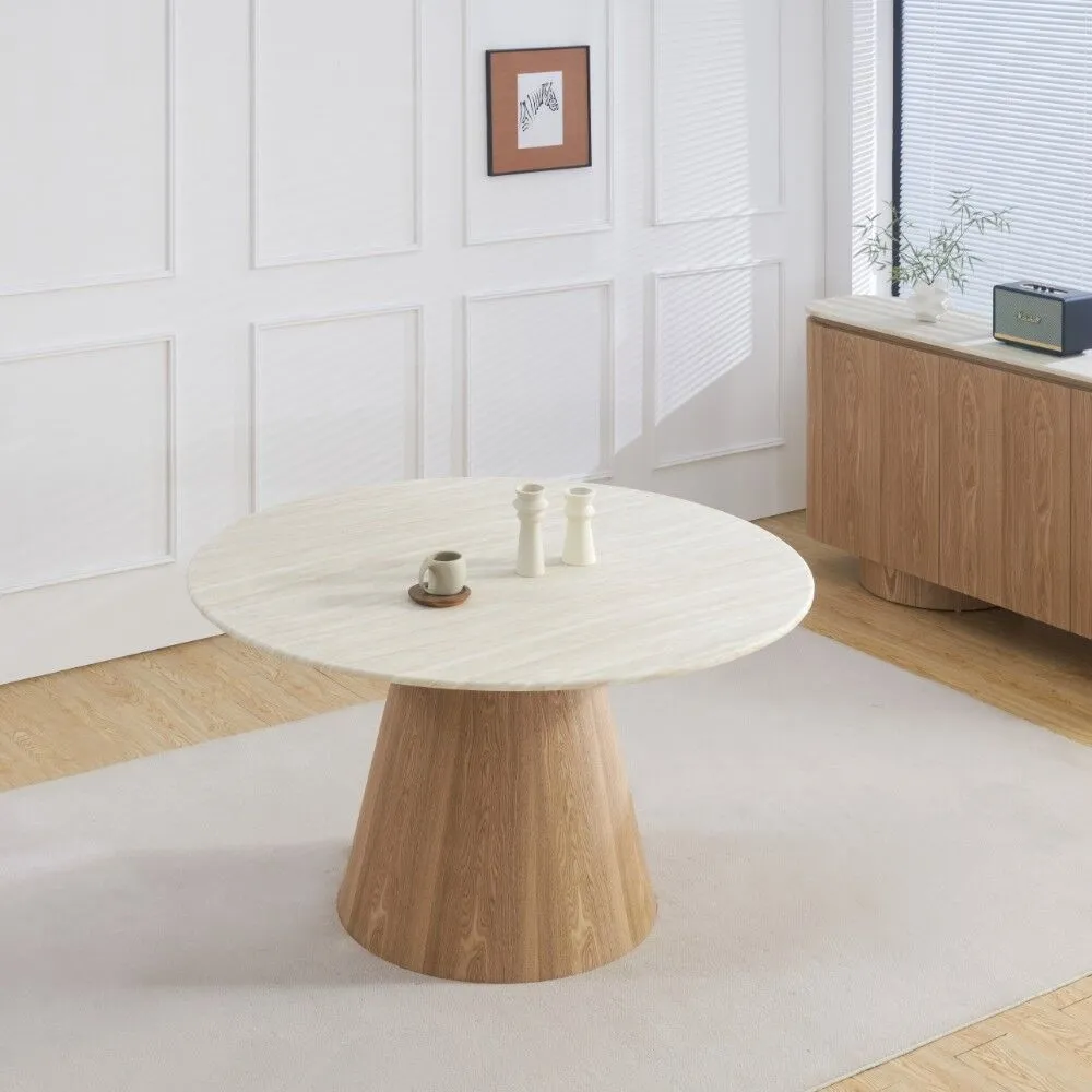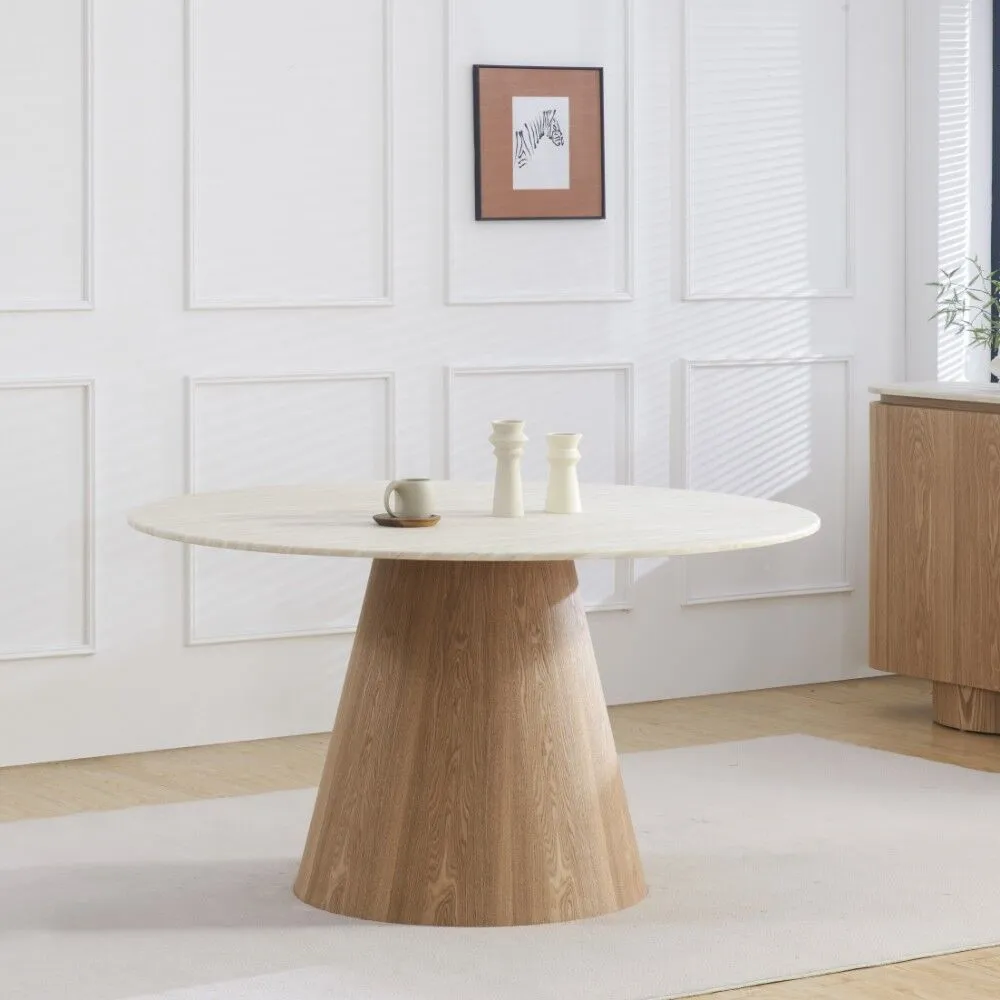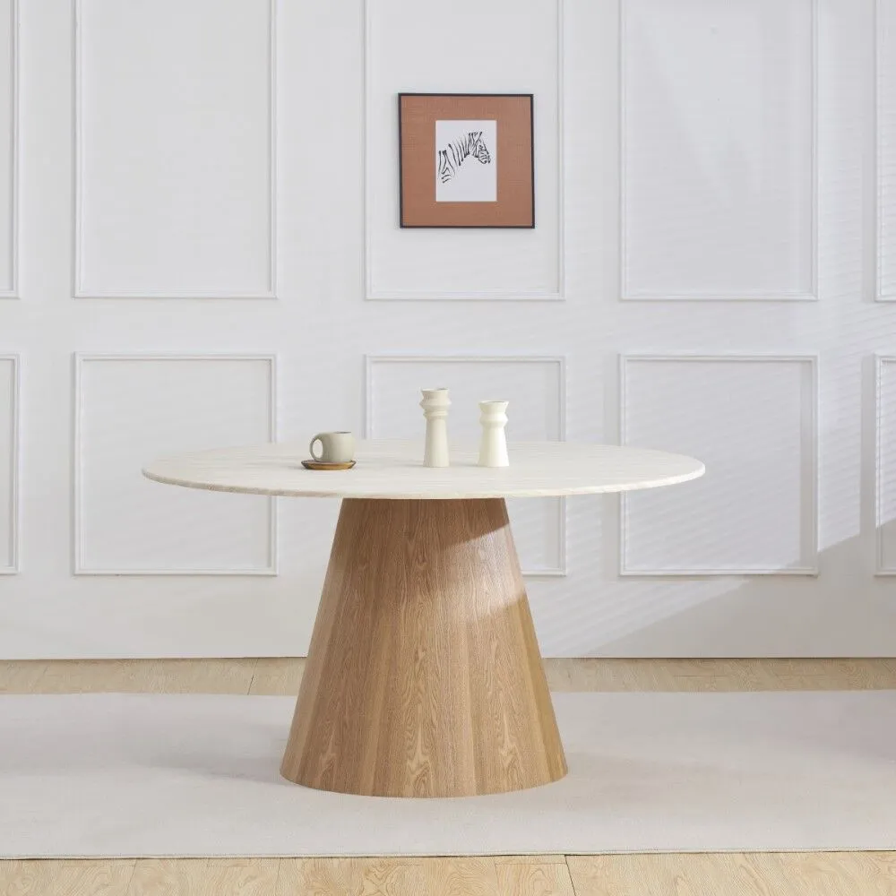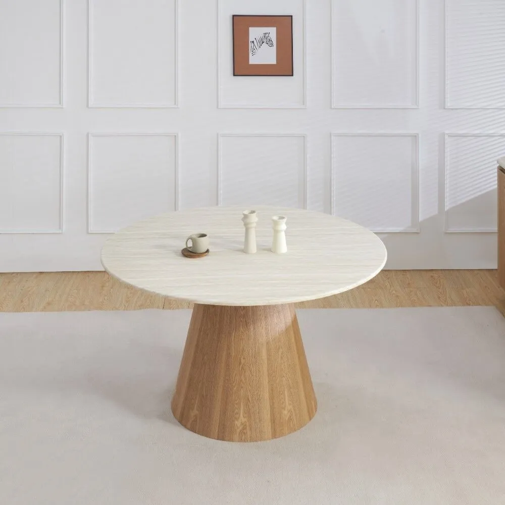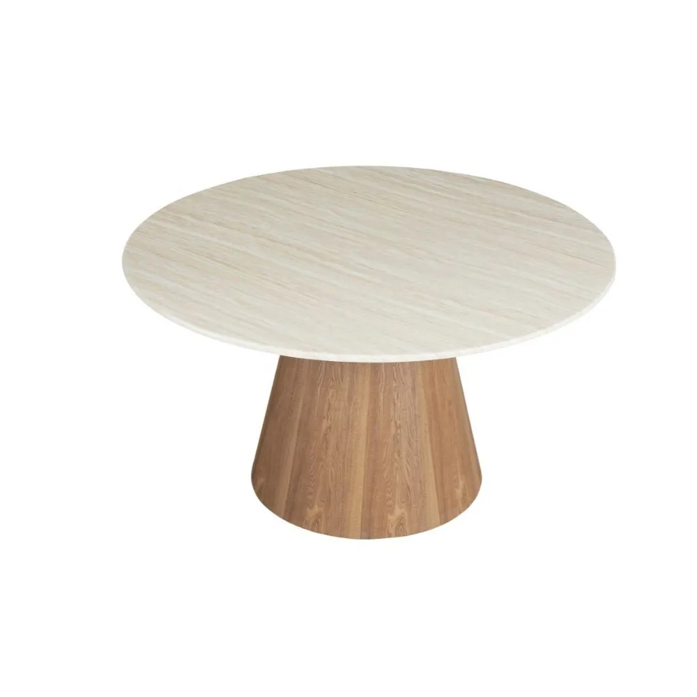 سطح الطاولة مصنوع من الرخام الصناعي عالي الجودة، مع أرجل متينة من خشب MDF أملس مغلف بقشرة خشب طبيعي أصلية، ما يوفر توازنًا مثاليًا بين القوة، الثبات، والمظهر الجمالي.اللون: