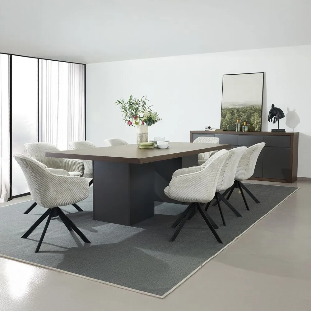 تضفي هذه الطاولة مزيجًا متناغمًا من المتانة والأناقة إلى مساحة تناول الطعام الخاصة بك. تم تصميمها بطبقة نهائية من الميلامين، وهي مقاومة للخدش والبقع، مما يضمن لها جاذبية ووظيفة تدوم طويلاً. يتمتع تصميمها الواسع باستيعاب ما يصل إلى ثمانية أشخاص بشكل مريح، مما يجعلها مثالية للتجمعات والوجبات العائلية. يوفر البناء القوي متانة استثنائية، بينما يضمن السطح سهل التنظيف صيانة سهلة. مثالية للديكورات الداخلية الحديثة والكلاسيكية، هذه الطاولة ترفع مستوى منزلك بتصميمها الأنيق والعملي.قد يختلف لون المنتج قليلاً بسبب مصادر الإضاءة الفوتوغرافية أو إعدادات الشاشة/شاشتك.تُباع كراسي الطعام بشكل منفصل.