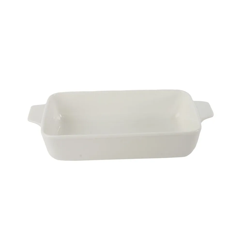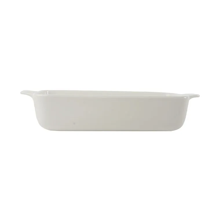 طبق مستطيل الشكل مصنوع من البورسلان باللون الأبيض ذو عمق مناسب لإحتواء مختلف الأصناف, وهو إختيار مثالي لتقديم وتنسيق الأطعمة بشكل جميل ومنظم.