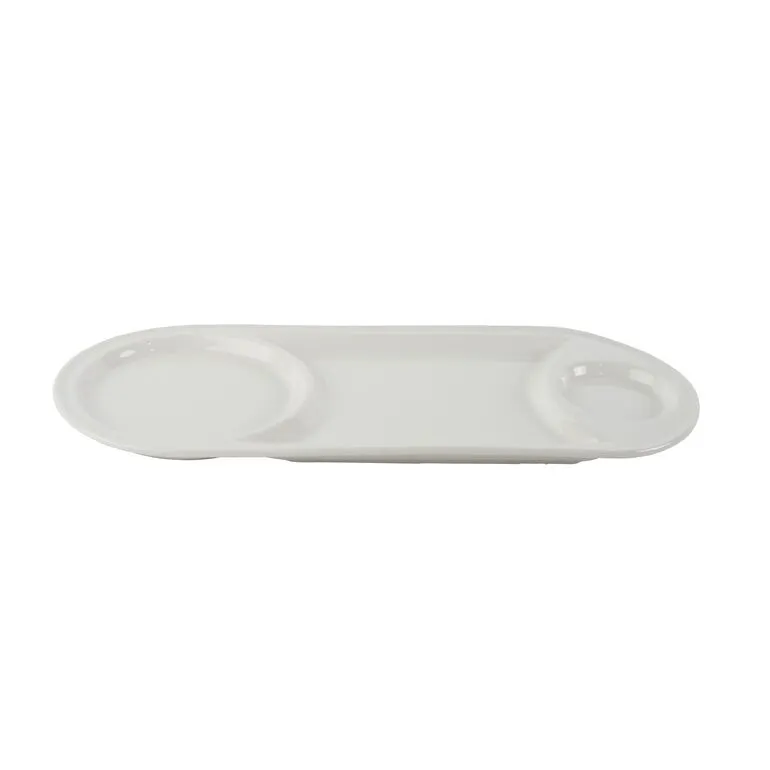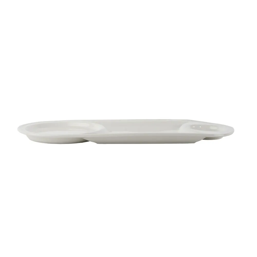 طبق تقديم مستطيل الشكل مقسم إلى قسمين مصنوع من البورسلان باللون الأبيض, مناسب لإحتواء مختلف الأصناف ويعتبر إختيار مثالي لتقديم وتنسيق الأطعمة بشكل جميل ومنظم.