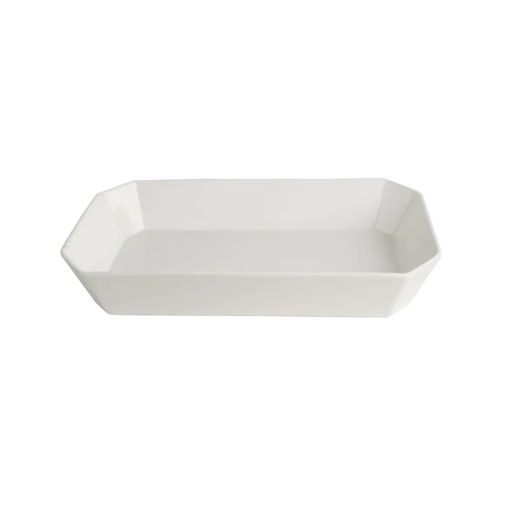 طبق تقديم مستطيل الشكل مصنوع من البورسلان باللون الأبيض, مناسب لإحتواء مختلف الأصناف وإختيار مثالي لتقديم وتنسيق الأطعمة بشكل جميل ومنظم.
