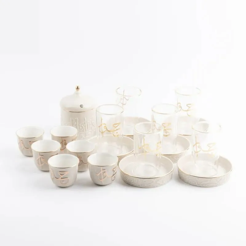 قدمي ضيافتك بطريقة مميزة وأنيقة مع طقم الشاي والقهوة العربية المصنوع من أجود أنواع المواد الفاخرة. أنيق وعصري لتقديم الشاي والقهوة للضيوف والعائلة في المناسبات الخاصة والعامة. ذات مظهر فاخر يعزز جاذبية طاولة الضيافة الخاصة بك.