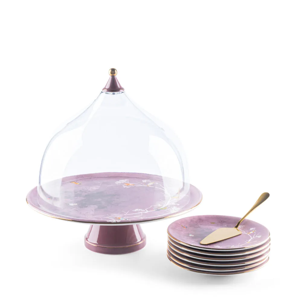 | يتضمن الطقم | 6 صحون وسكين تقطيع و حامل كيك مع غطاء |