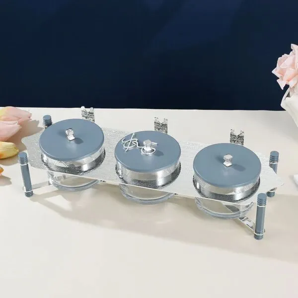 طقم تقديم مكسرات 3 قطع مع صينية تقدم تجربة فريدة لعشاق المكسرات ، بتصميم فاخر يجمع بين الأناقة والتميز، تضيف لمسة من الفخامة والجمال إلى مناسباتكم الخاصة ولحظات الاسترخاء، بفضل تصميمها الراقي وتفاصيلها الدقيقة، تعد قطعة ديكورية ساحرة تضفي طابعًا مميزًا على طاولة الضيافة، مما يجعلها خيارًا مثاليًا كهدية فريدة للأحبة.