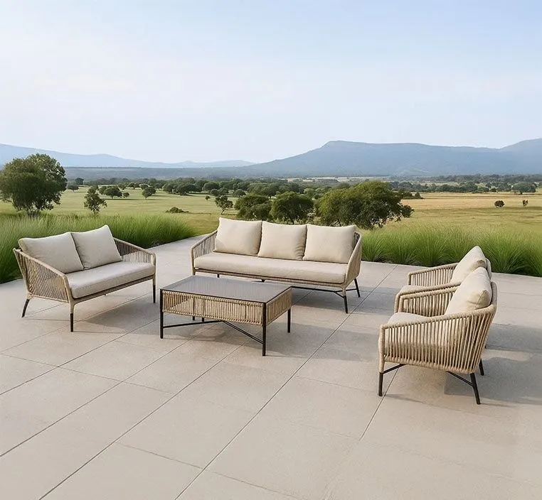 اللون البيج يمنح الطقم مظهراً هادئاً ودافئاً يتناغم مع مختلف المساحات الخارجية, مصنوع من خامات متينة تتحمل الاستخدام الخارجي وتقاوم عوامل الطقس المختلفة.