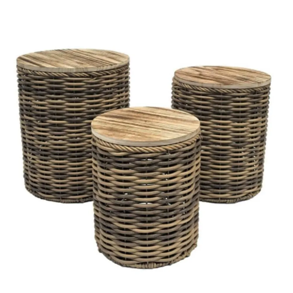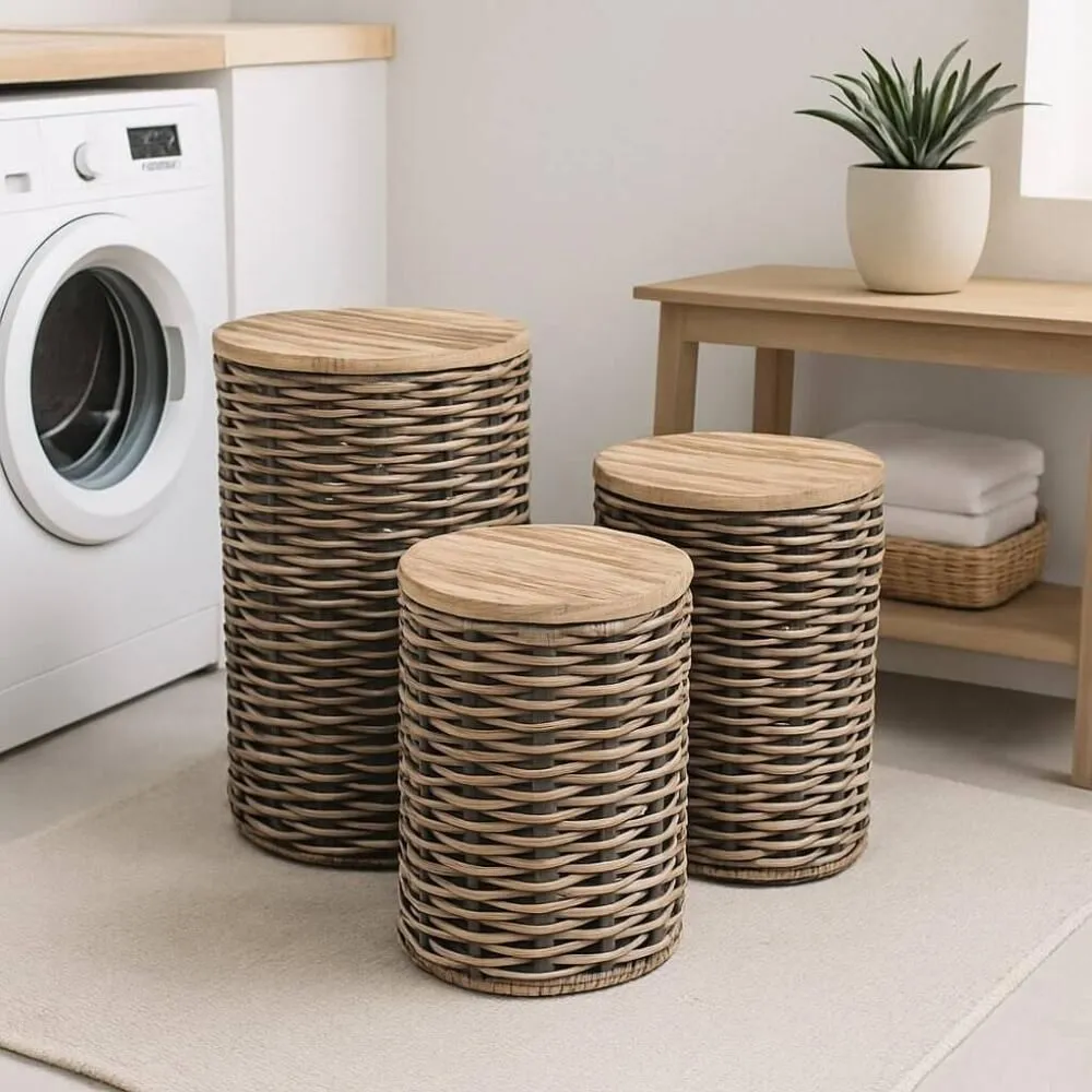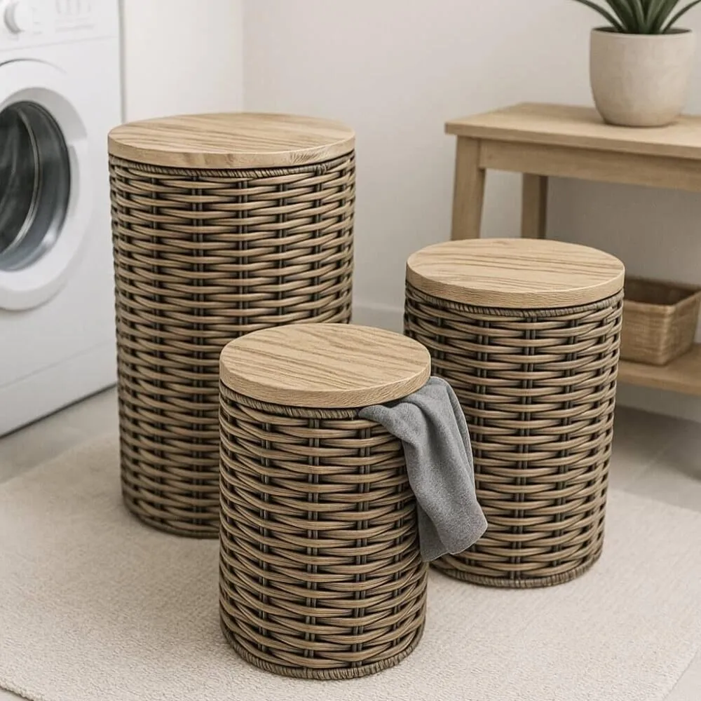طقم سلال راتان صناعي بغطاء خشب تتميز بتصاميم بسيطة وأنيقة تضفي لمسة طبيعية .
