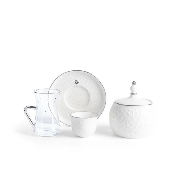 | يتضمن الطقم | 6 استكانات شاي و 6 صحون و 6 فناجين قهوة عربية وسكرية |