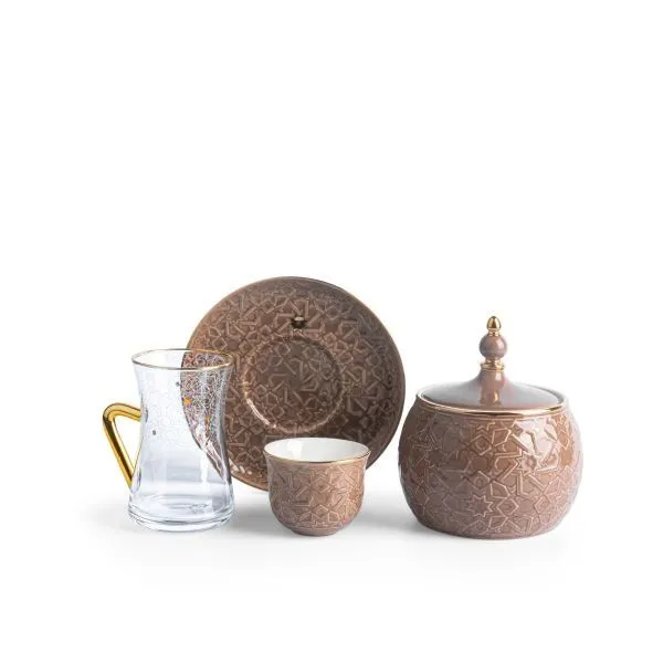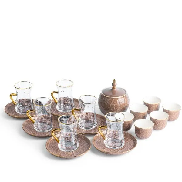 | يتضمن الطقم | 6 استكانات شاي و 6 صحون و 6 فناجين قهوة عربية وسكرية |