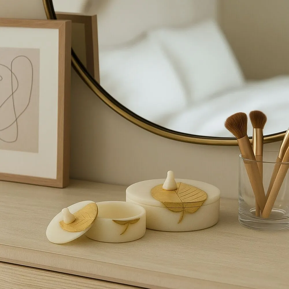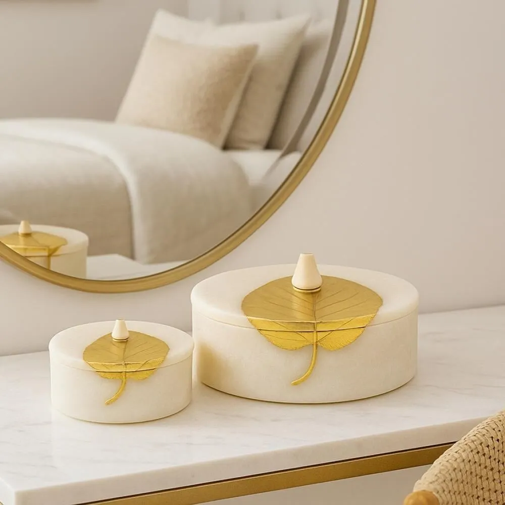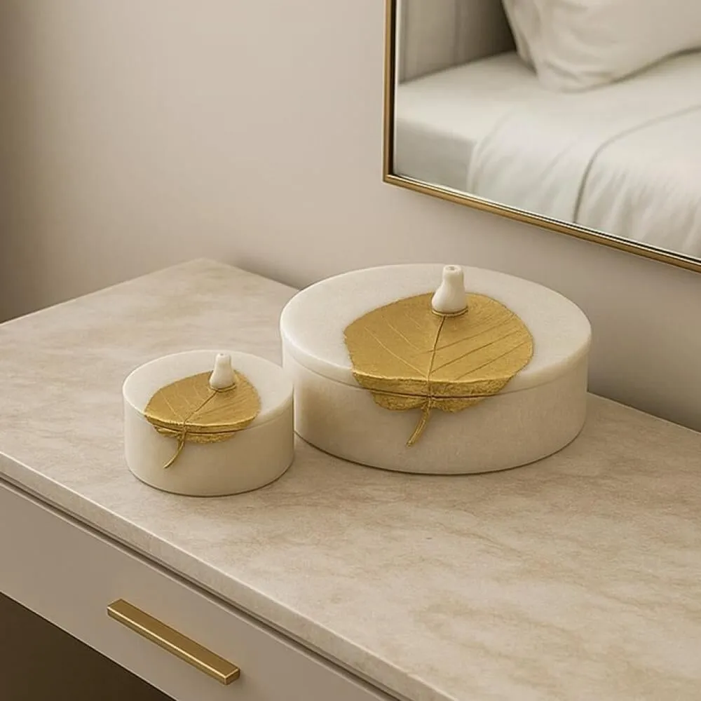 أضف لمسة من الرقي والجمال إلى منزلك مع هذا الطقم الفاخر المكوّن من علبتين ديكوريتين بتصميم عصري يجمع بين البساطة والفخامة. تأتي العلب بملمس راقٍ وتفاصيل دقيقة، يتوّجها غطاء ذهبي على شكل ورقة فخمة تضفي لمسة من الفن والترف على أي زاوية توضع فيها.