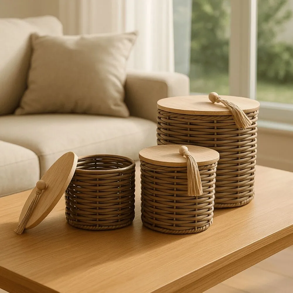 علب تخزين أنيقة مصنوعة من الراتان الصناعي الصديق للبيئة، تجمع بين المتانة والجمال لتضفي لمسة طبيعية دافئة على أي مساحة.