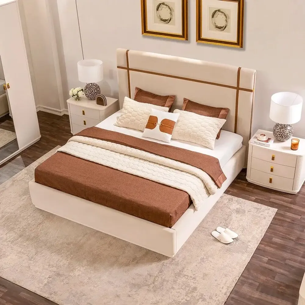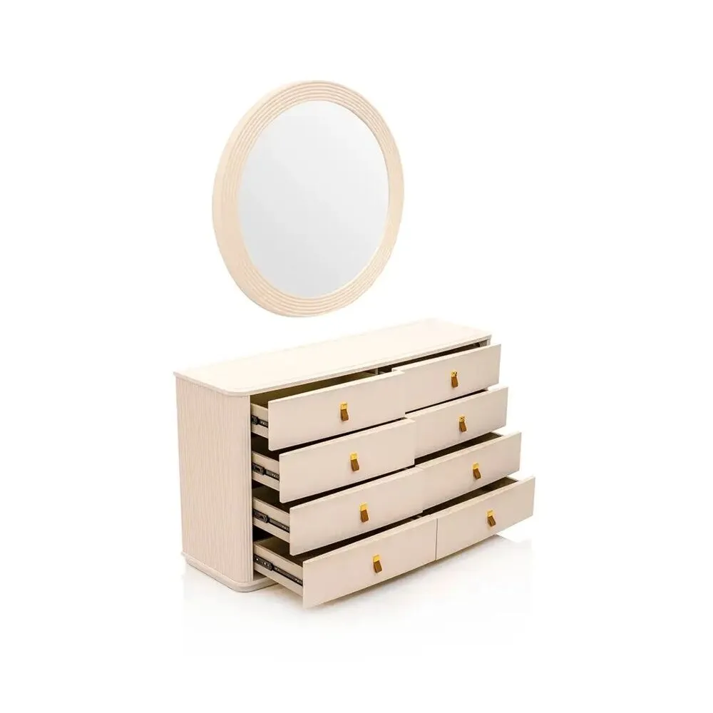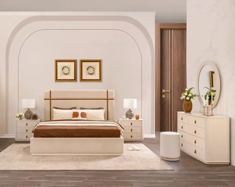 | يتضمن الطقم | 1 سرير - 2 كمودينو - 1 طاولة تزيين - 1 مرآة طاولة تزيين - 1 كرسي طاولة تزيين فقط |