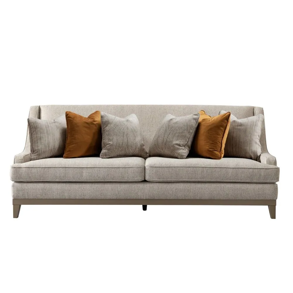 الألوان: يعتمد على اللون البيج الفاتح الذي يمنح إحساساً بالفخامة والهدوء، مع وسائد بألوان محايدة ودافئة مثل البني والرمادي لخلق تباين أنيق وإضفاء عمق بصري.