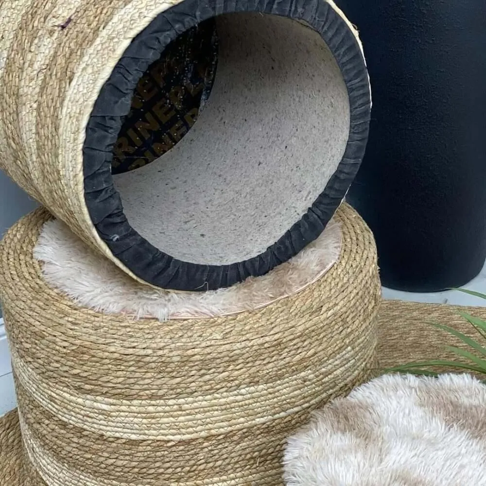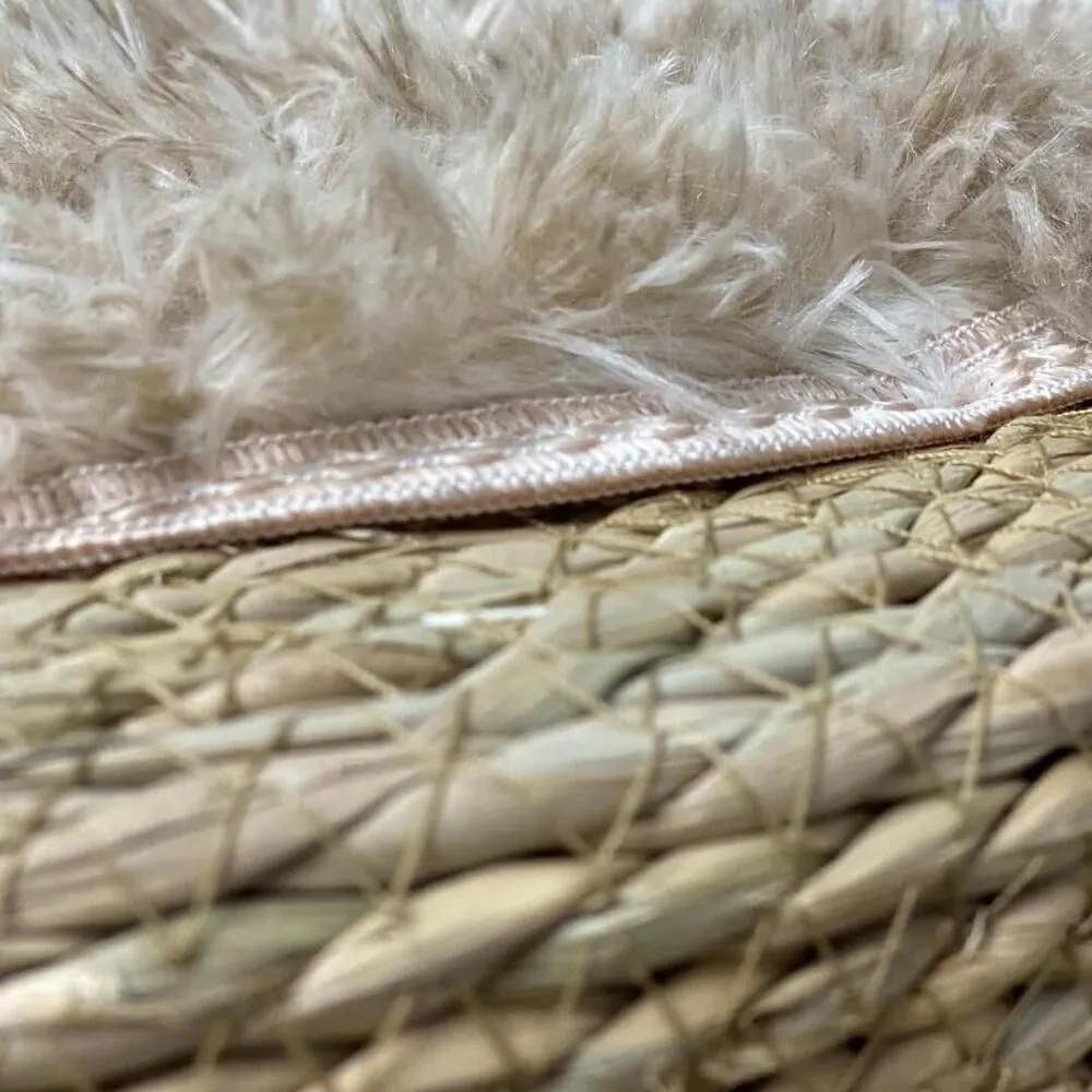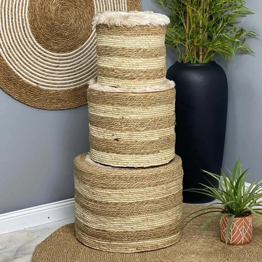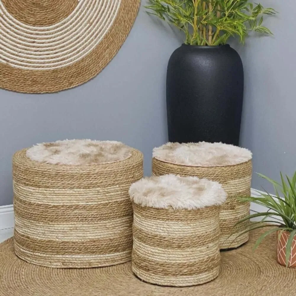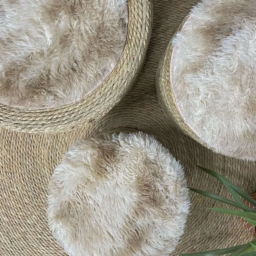 أضيفي لمسة من الدفء الطبيعي والنعومة الفاخرة إلى ديكور منزلك مع طقم البَف المميز المصنوع من الخوص الطبيعي والمغطى بطبقة ناعمة من الفرو.