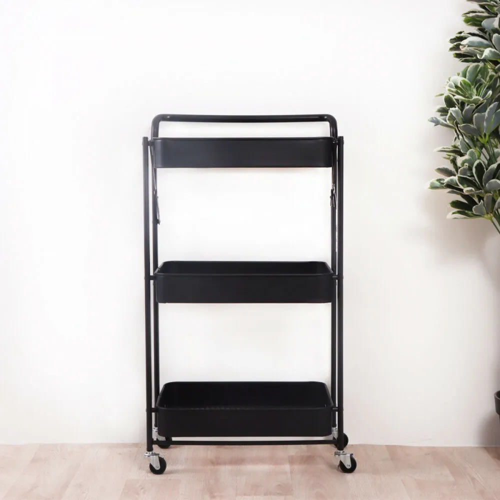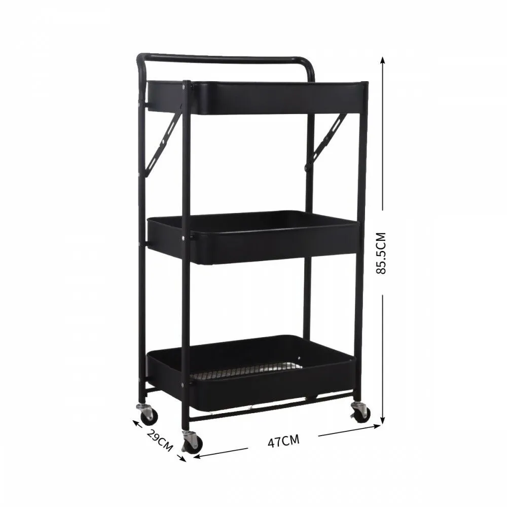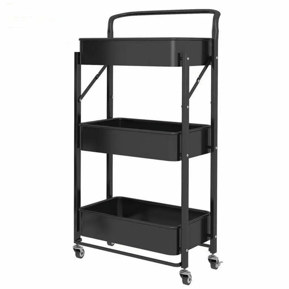 عربة تخزين حديد 3 دور بيد قابلة للطي أسود