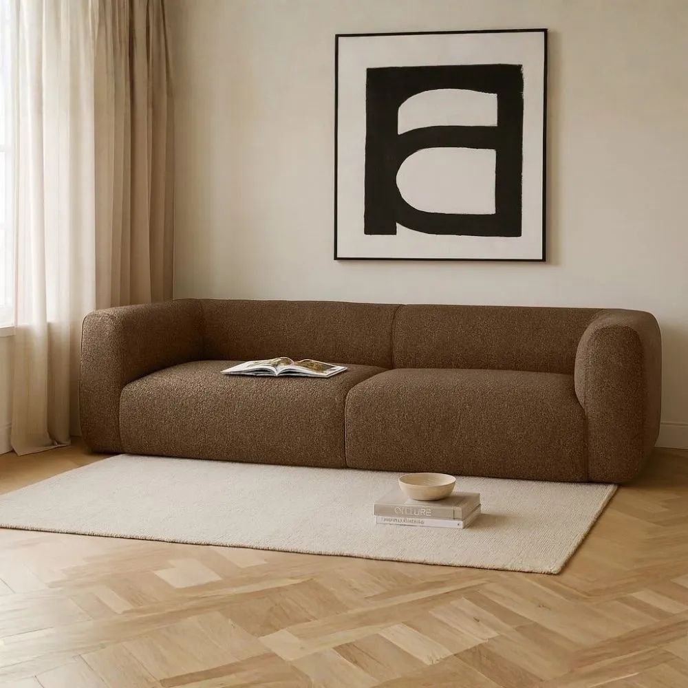 تتميّز بتصميمها العصري البسيط ولمستها الفاخرة. مصنوعة من مزيج قماش القطن والكتان الذي يجمع بين النعومة والمتانة، ومزوّدة بإطار قوي من خشب الصنوبر يمنحها ثبات عالي وطول عمر. تأتي باللون البني الدافئ الذي يضيف إحساس بالدفء والأناقة للمكان، وتتميّز بخلوّها من الوسائد لتمنح مظهراً انسيابياً عصرياً يناسب مختلف أنماط الديكور.