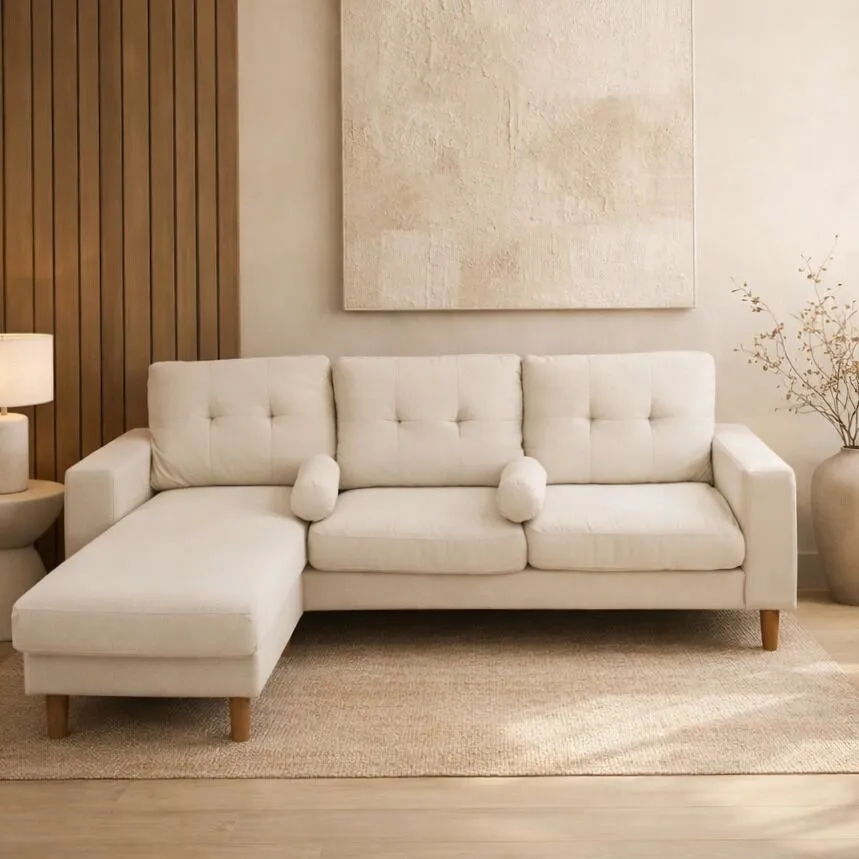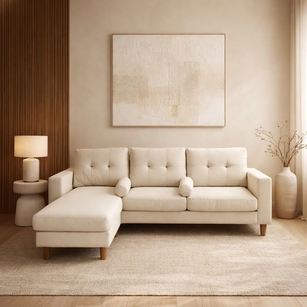 كنبة أنيقة وعصرية بتصميم على شكل حرف L، تأتي بقماش كتان بلون بيج هادئ يعطي ايحاء بالدفء والراحة والحيادية والطبيعة والبساطة والمرونة. مثالي لخلق أجواء هادئة ومألوفة مع ارجل بلاستيكية تضيف لمسة دافئة للمكان. مزودة باريكة استرخاء لراحة إضافية، مثالية لغرف المعيشة ذات الطابع الحديث.