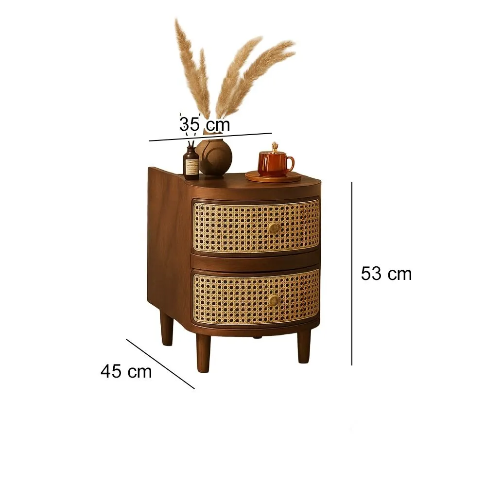 أضف لمسة من الأناقة الطبيعية والدافئة إلى غرفة نومك مع هذا الكومدينو الخشبي المصمم بعناية، والذي يجمع بين البساطة والفخامة. يتميز بتفاصيل مستوحاة من الطراز البوهيمي والسكندنافي، مع واجهات أدراج مصنوعة من خامة الراتان الطبيعي، مما يمنحه طابعًا عصريًا ومريحًا في آن واحد.