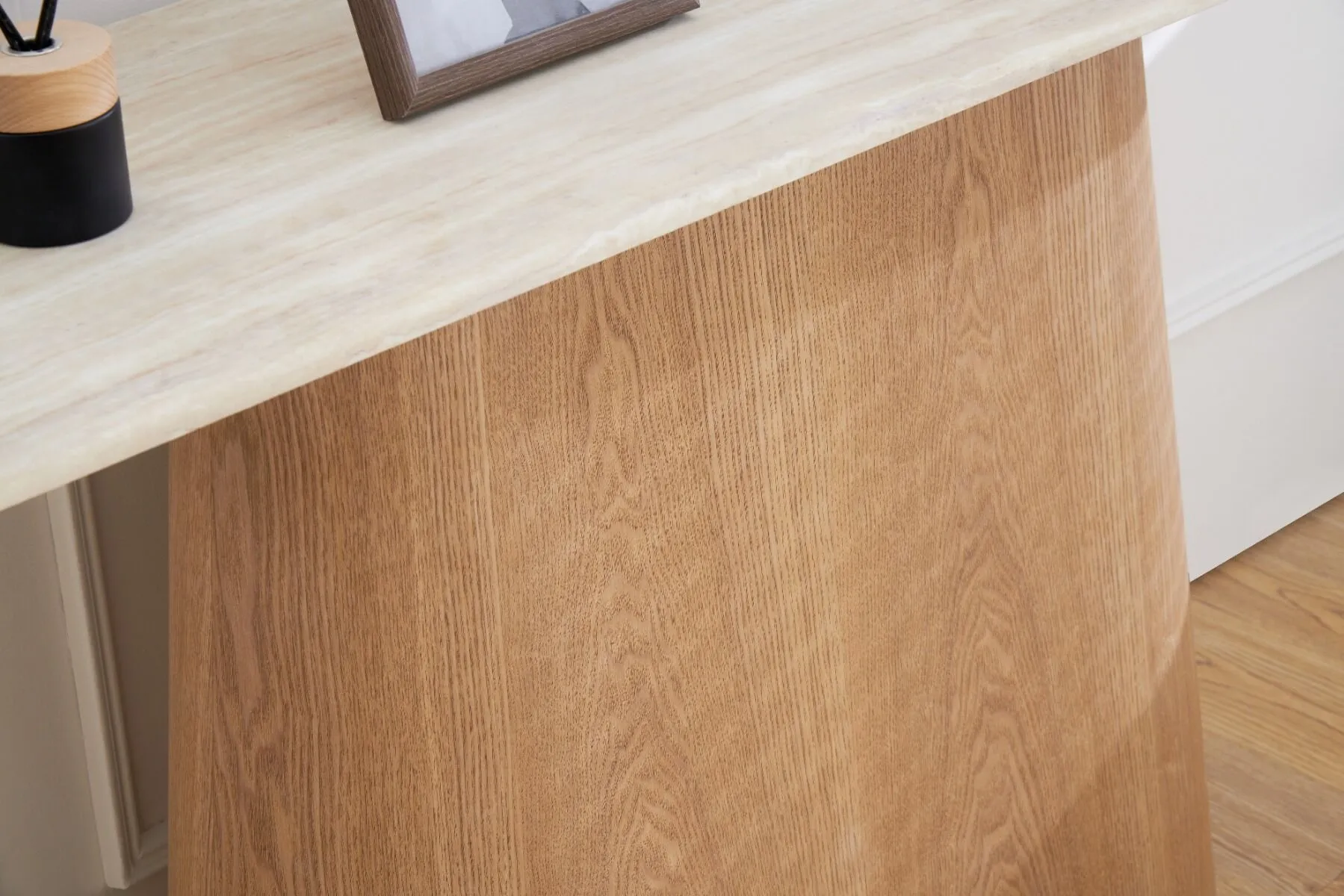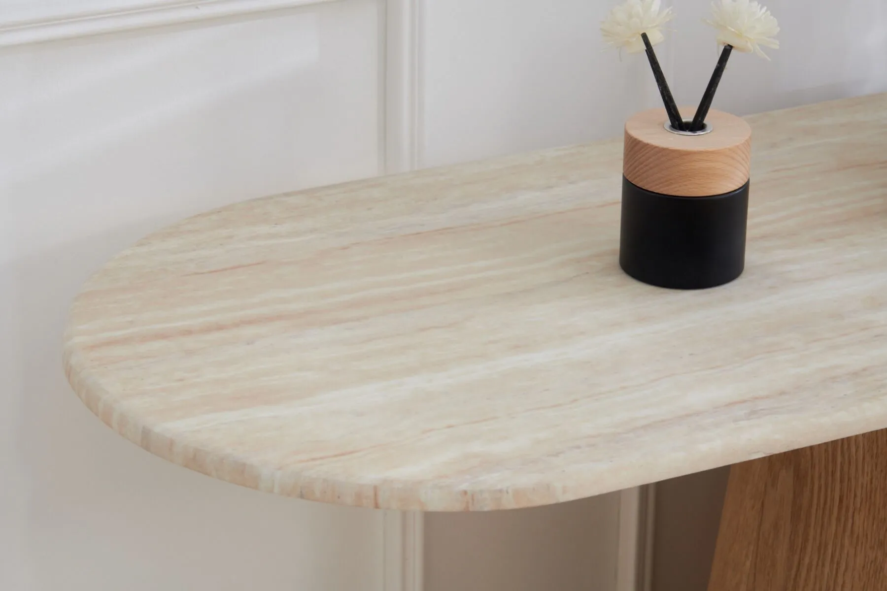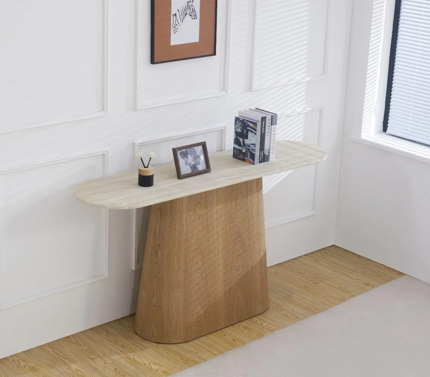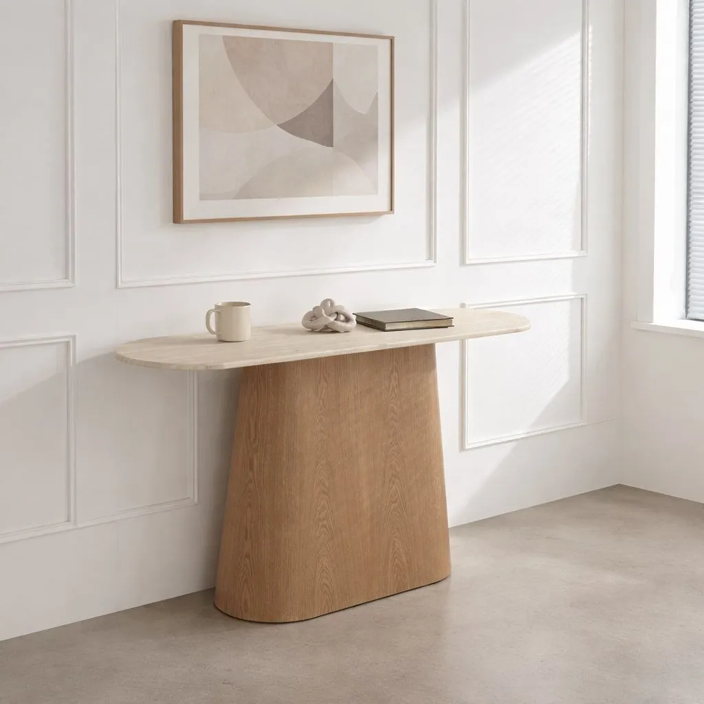 سطح الكونسول مصنوع من الرخام الصناعي عالي الجودة، مع قاعدة وأرجل متينة من خشب MDF أملس مغلف بقشرة خشب طبيعي أصلية، ما يوفر توازنًا مثاليًا بين القوة، الثبات، والمظهر الجمالي.اللون: