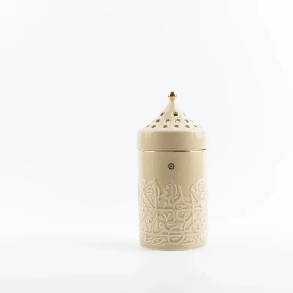 تصميم أنيق مصنوع من البورسلان، مزين بنقوش عربية دقيقة تضفي لمسة من التراث والجمال، يضم المنتج غطاء بفتحات متعددة تتيح خروج البخور بشكل متناسق، مع جسم المبخرة البورسلان ذات حجم مميز وسهل الحمل، تكتمل أناقة المبخرة بوعاء معدني صغير لوضع البخور بسلاسة.