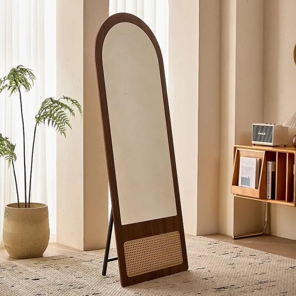 مرآة أرضية طويلة بإطار خشب وراتان - تصميم أنيق وعصري أضف لمسة من الأناقة الطبيعية إلى ديكور منزلك مع هذه المرآة الأرضية الطويلة المصنوعة من الخشب والرّاتان الطبيعي. تصميمها المنحني العلوي يمنحها طابعاً هادئاً وراقياً، مع قاعدة من الراتان المفرغ تضيف لمسة فنية فريدة. تأتي مزودة بإستاند حديدي خلفي بلون أسود يمنحها ثباتًا ممتازًا وسهولة في النقل والترتيب.