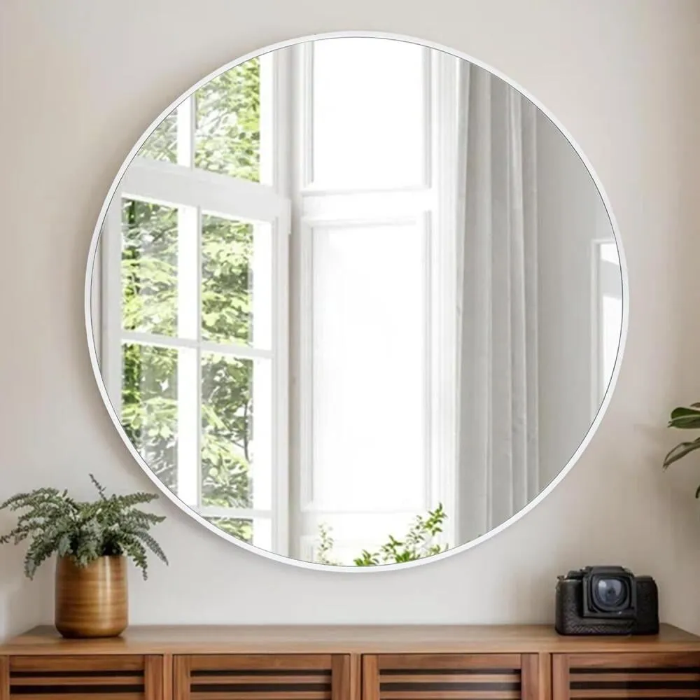مرآة جدارية مدورة بإطار ألمنيوم ابيض أنيق الوصف: أضف لمسة من الرقي والفخامة إلى أي مساحة في منزلك مع هذه المرآة الجدارية المدورة المصممة بإطار أنيق من الألمنيوم بااللون الابيض . تصميمها العصري والبسيط يجعلها قطعة ديكور مثالية تناسب مختلف أنماط الديكور الداخلي، من الكلاسيكي إلى الحديث وحتى البوهيمي.