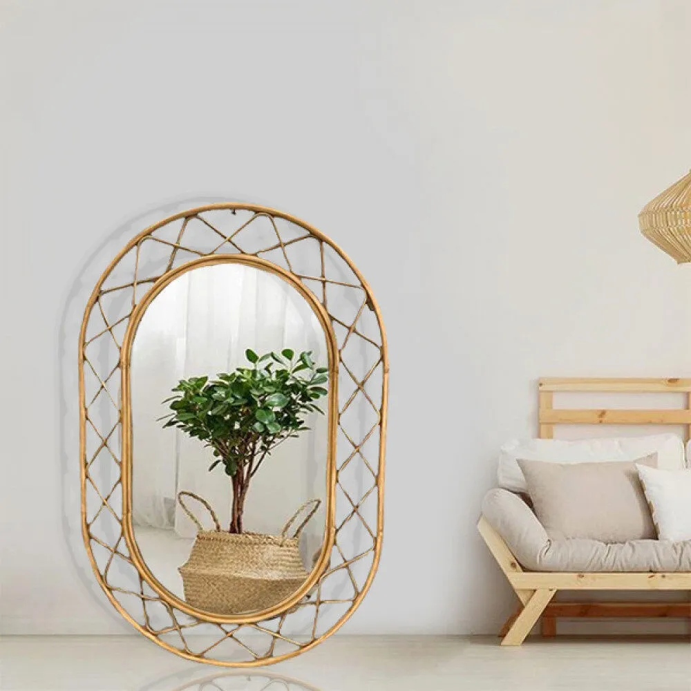 ستكون هذه المرايا الزجاجية بإطار خشبي بلون أصفر على شكل بيضاوي مخرم والسطح الزجاجي العاكس بتصميم بيضاوي إضافة رائعة للديكور الداخلي للمنزل أو المكان العام. ستجذب الأنظار وتضفي لمسة من الجمال والإبداع وتجعل المكان يبدو مزهلًا وأنيقًا. إنها قطعة فريدة وجميلة ستضفي لمسة فنية لا تُنسى على المكان .