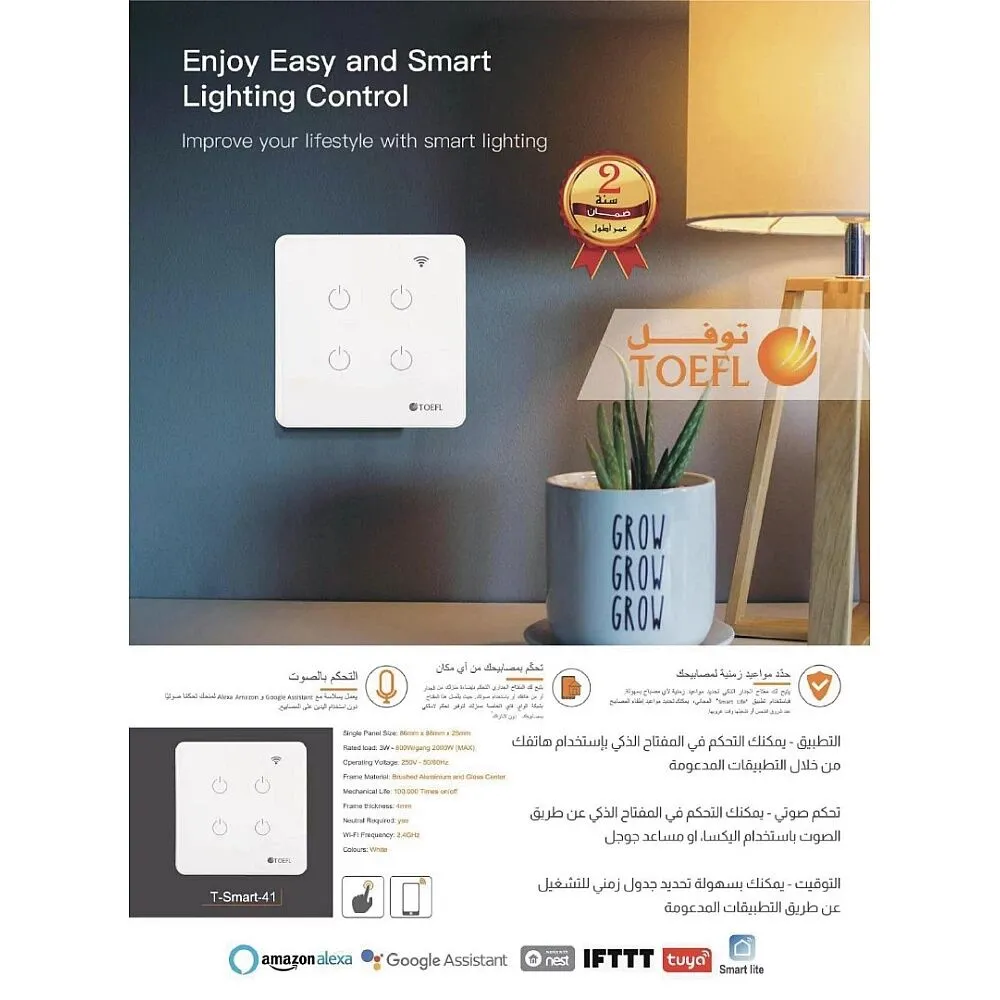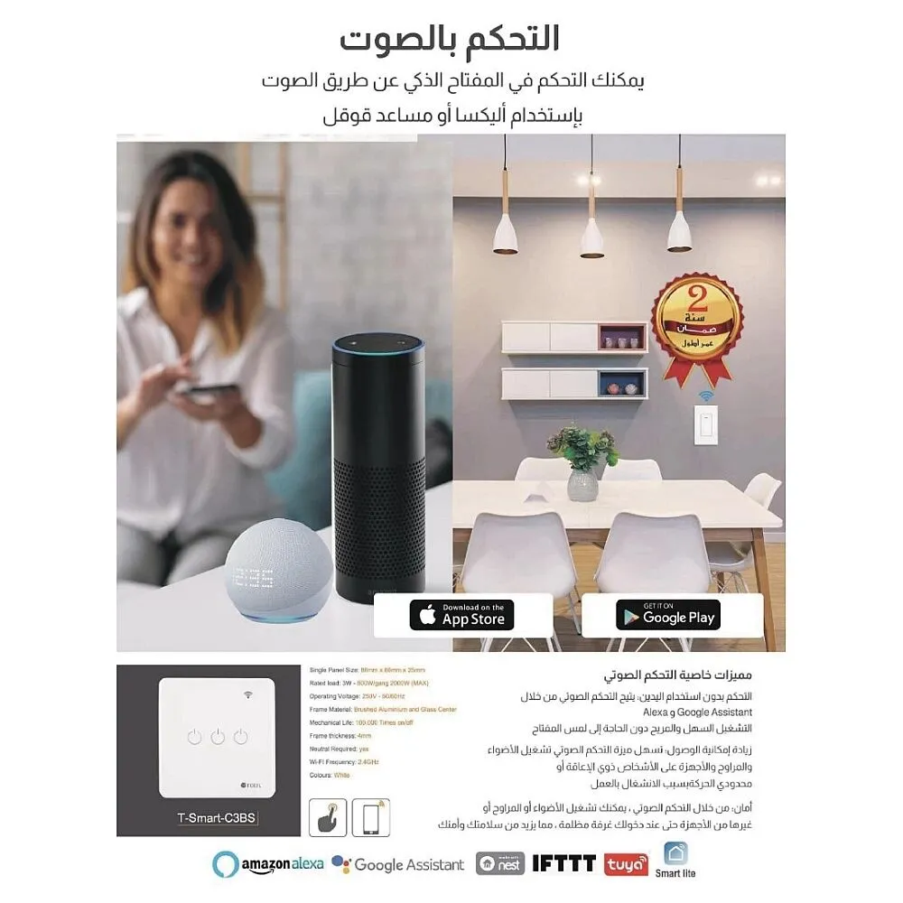 اكتشف مفتاح الجدار الكهربائي الذكي الجديد الذي يأخذ تحكم منزلك إلى مستوى جديد تمامًا! مع مفتاح الجدار الذكي، يمكنك الآن التحكم في أضواء منزلك وأجهزتك الكهربائية بكل سهولة وبنقرة زر عبر هاتفك الذكي.هل تريد تشغيل الأضواء قبل دخول المنزل أو إيقاف تشغيلها عند مغادرته؟ لا مشكلة! مع تقنية الواي فاي وتطبيق سمارت هوم، يمكنك التحكم في مفتاح الجدار الكهربائي الذكي من أي مكان عبر هاتفك الذكي. ببضع نقرات، ستكون قادرًا على ضبط الإضاءة والأجهزة الكهربائية بسهولة تامة.لا حاجة للقلق بشأن التواجد في المنزل، فمفتاح الجدار الذكي يدعم التحكم عبر اليكسا أيضًا. ما عليك سوى استخدام الأوامر الصوتية للتحكم في أجهزتك بمجرد قولك "أليكسا، اغلق الأنوار" أو "أليكسا، شغل التلفاز".يتميز المفتاح بتصميم لمسي أنيق وسهل الاستخدام، مما يوفر لك التحكم الفوري بالأجهزة الكهربائية بلمسة واحدة فقط.اجعل من تجربة الحياة الذكية تجربة مذهلة ومريحة، احصل على مفتاح الجدار الكهربائي الذكي الآن وانطلق نحو مستقبل يسهل التحكم فيه بمنزلك بكل يسر وسلاسة!