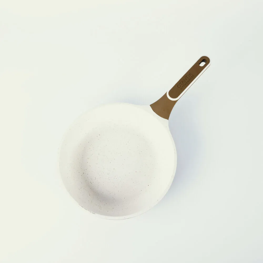 مقلاة غير لاصقة بدون غطاء مصنوعة من خامات عالية الجودة باللون البيج والبني.