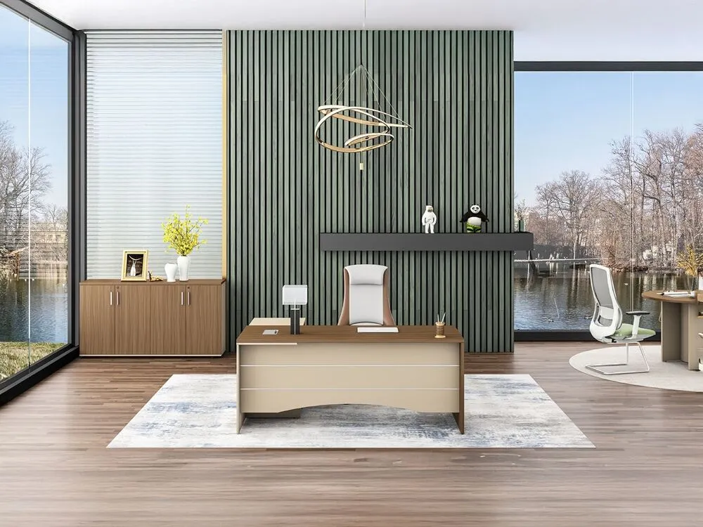 إدارة الأسلاك: يحتوي المكتب على فتحات مخصصة لتنظيم الأسلاك، مما يحافظ على مظهر مرتب ونظيف.